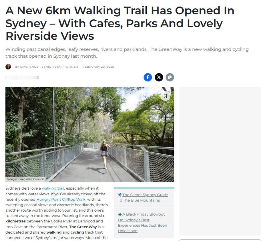 悉尼新开宝藏步道!河景+咖啡公园一次走完 最近 Sydney 新开的 The GreenWay 真的很适合周末走走~ 全长大概 6 公里,从 Earlwood 一路走到 Parramatta River,沿途都是河景、公园、绿树,还有很多咖啡店可以中途休息 ☕️ 整条路基本是平的,超级好走! ✔️ 适合散步 ✔️ 适合慢跑 ✔️ 适合骑车 ✔️ 推婴儿车也完全OK 一路会经过很多绿地和公园,环境很舒服,不会太晒,而且还有很多休息区。慢慢走大概 2 小时多一点,不赶时间的话可以分段走。 📍优点是交通也很方便 旁边就是 Inner West 轻轨线,随时可以上车下车分段玩~ 如果你已经走过 Hungry Point 那条海边步道,这条可以列入下一个打卡清单了! 更安静、更日常一点,属于本地人慢生活路线 🌳 适合周末放空,也适合下班后随便走一圈~ 生活周末去哪儿 悉尼打卡 澳洲 澳洲生活 澳洲移民 悉尼大学 悉尼