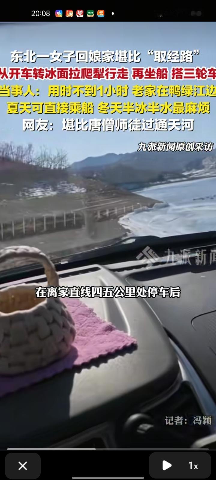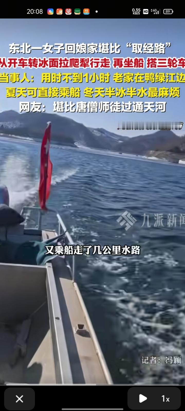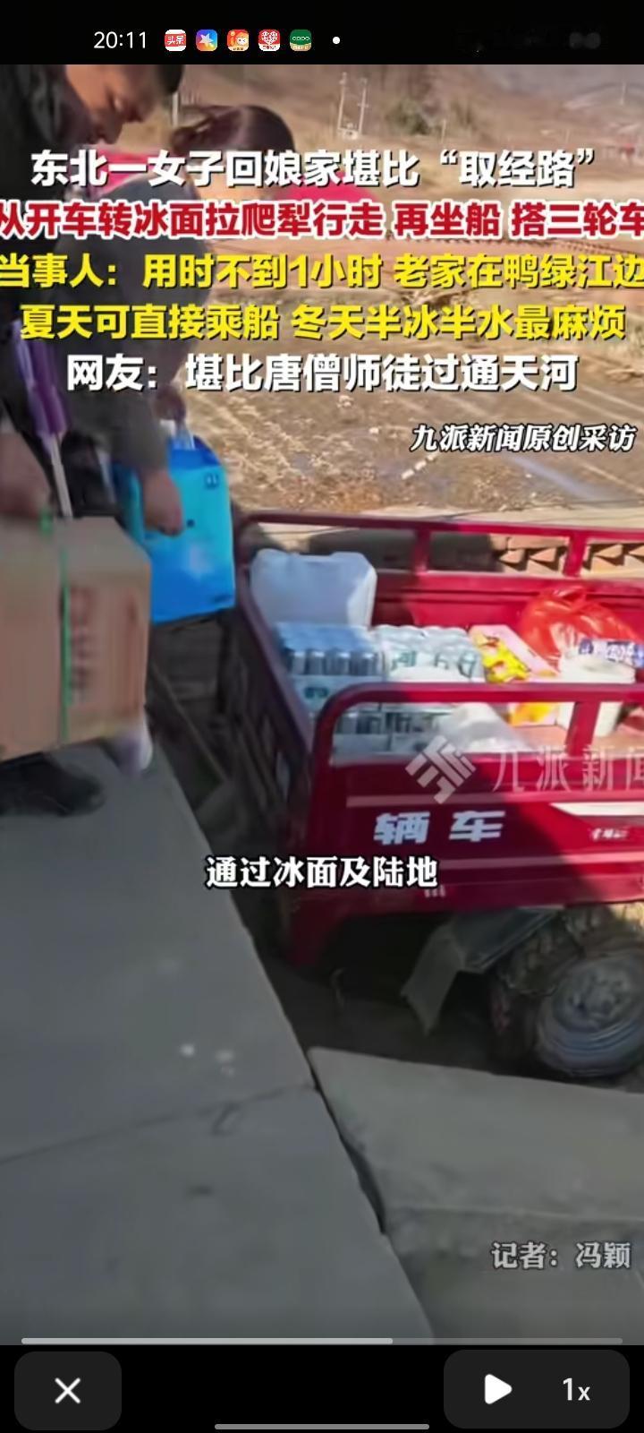 2月19日,辽宁丹东。任女士年初二回娘家,在离家直线四五公里处停车后,用爬犁通过四五百米冰面,又乘船走了几公里水路,再辗转用爬犁和三轮车通过冰面及陆地,用时不到一小时到家。有网友调侃,回家方式堪比唐僧师徒过通天河。 任女士称,老家位于鸭绿江江边。平时主要走水路,夏天可直接乘船,冬天半冰半水最麻烦。