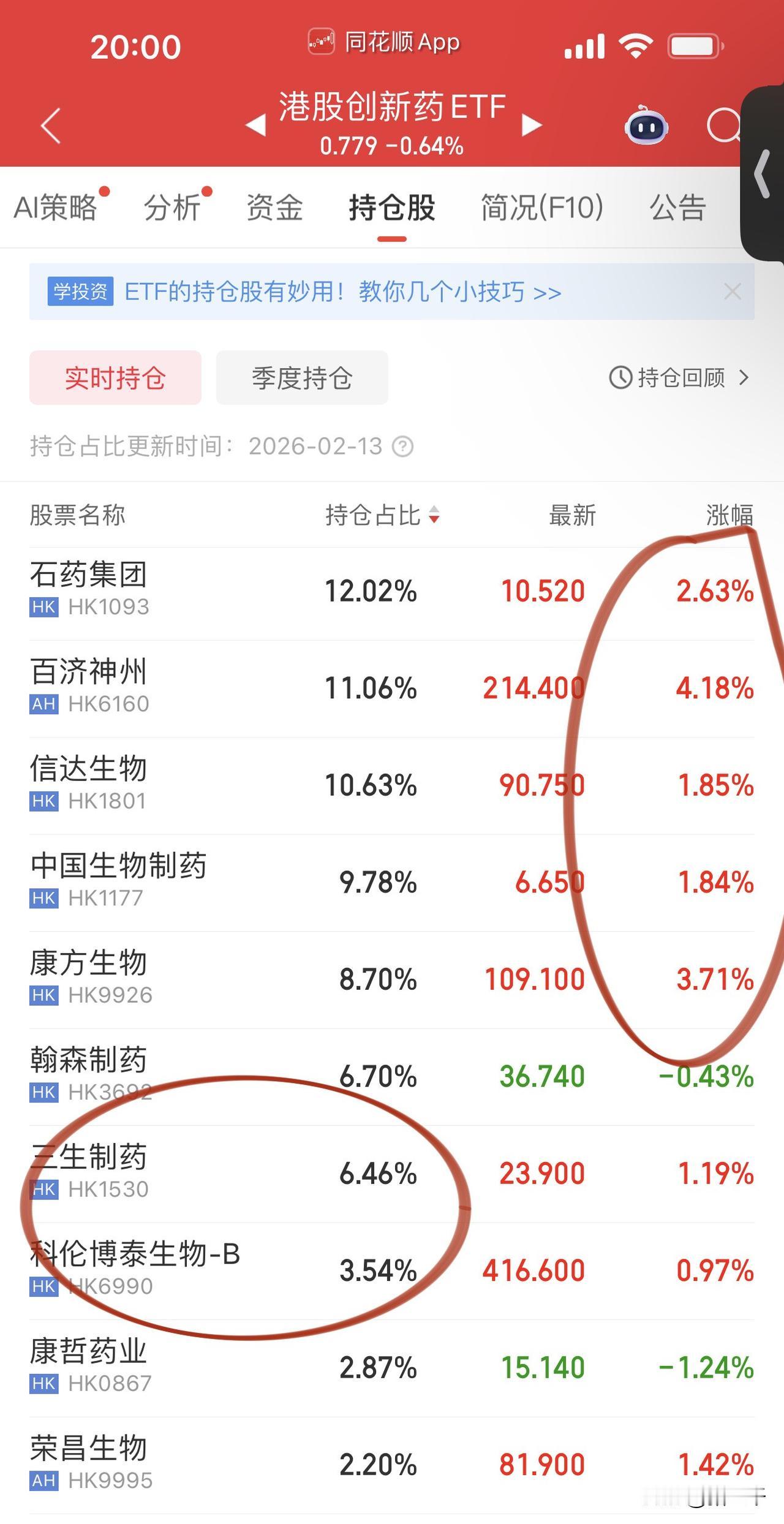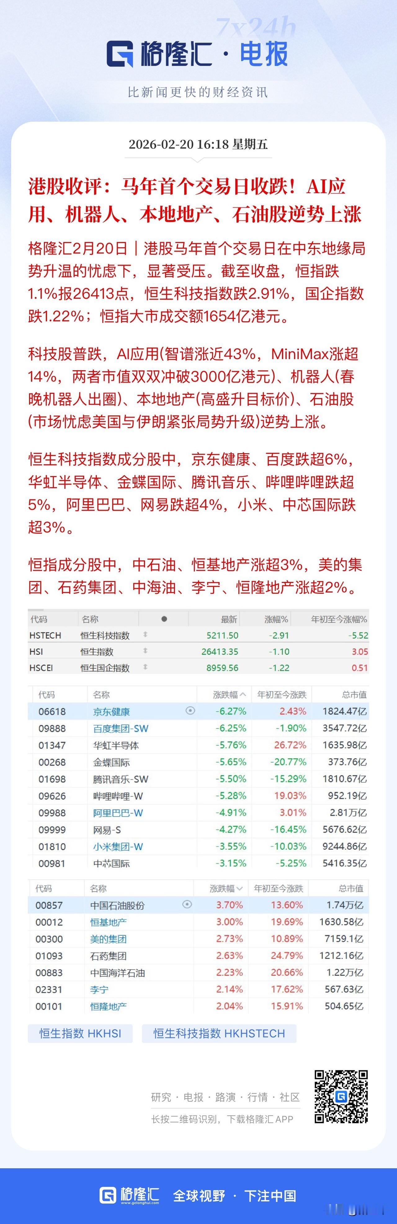 港股开门黑, 主要是权重股拖累! 局部行情还是不错, 智谱和mini Max继续创新高, 市值也双双站上3000亿港元, 智谱单日暴涨近43%干一天抵得上一年! 抛开石油股不谈, 港股本土地产股打响繁荣第一枪, 甚至有创历史新高的品种。 港股另一条主线: 创新药的表现也不差, 在最后时刻头部公司全部翻红, 百济神州领涨、 石药集团、康方生物跟进。 港股创新药ETF这一局稳了, 至少跑赢国债逆回购问题不大…