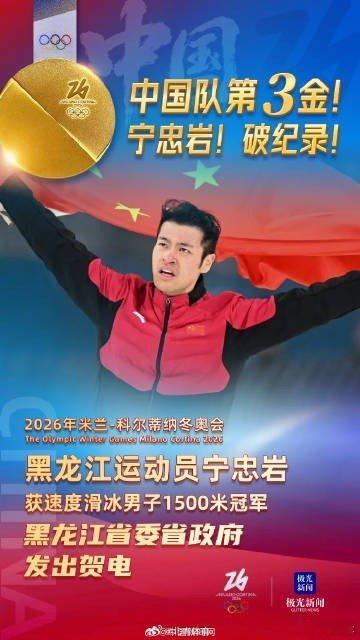 新春佳节之际,欣闻黑龙江运动员宁忠岩在米兰冬奥会速度滑冰男子1500米比赛中力克群雄、勇夺金牌,创造该项目新的奥运纪录,再现“龙江速度”、续写冰雪荣光,向世界展示了龙江儿女为国而战、为国争光的坚定信念和昂扬向上、积极进取的精神风貌,为祖国和人民赢得了荣誉,在新春佳节献上了一份宝贵贺礼!在此,黑龙江省委、黑龙江省人民政府及全省人民,向中国体育代表团、中国速度滑冰队和宁忠岩表示热烈的祝贺和崇高的敬意!衷心感谢国家体育总局对黑龙江体育事业的关心和支持!
