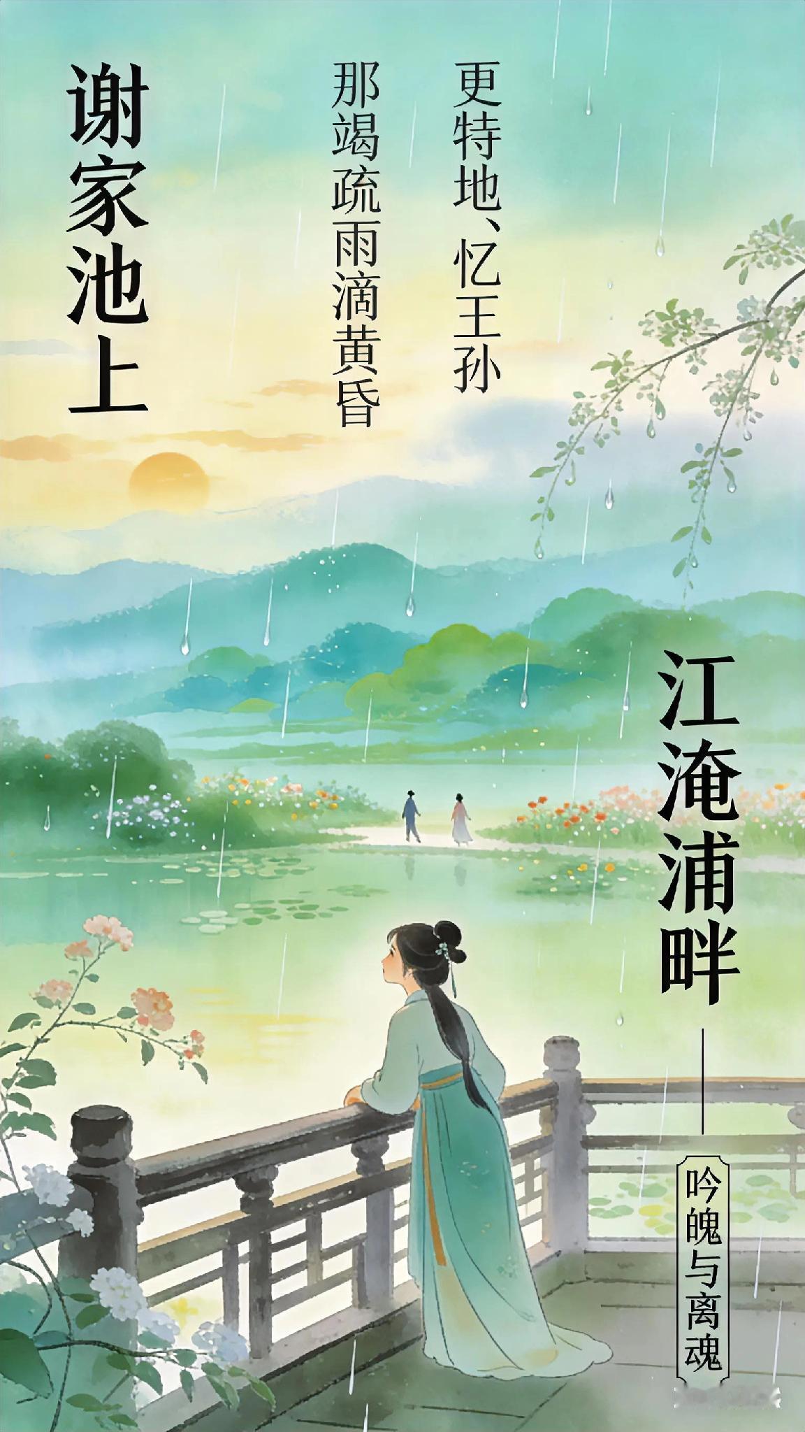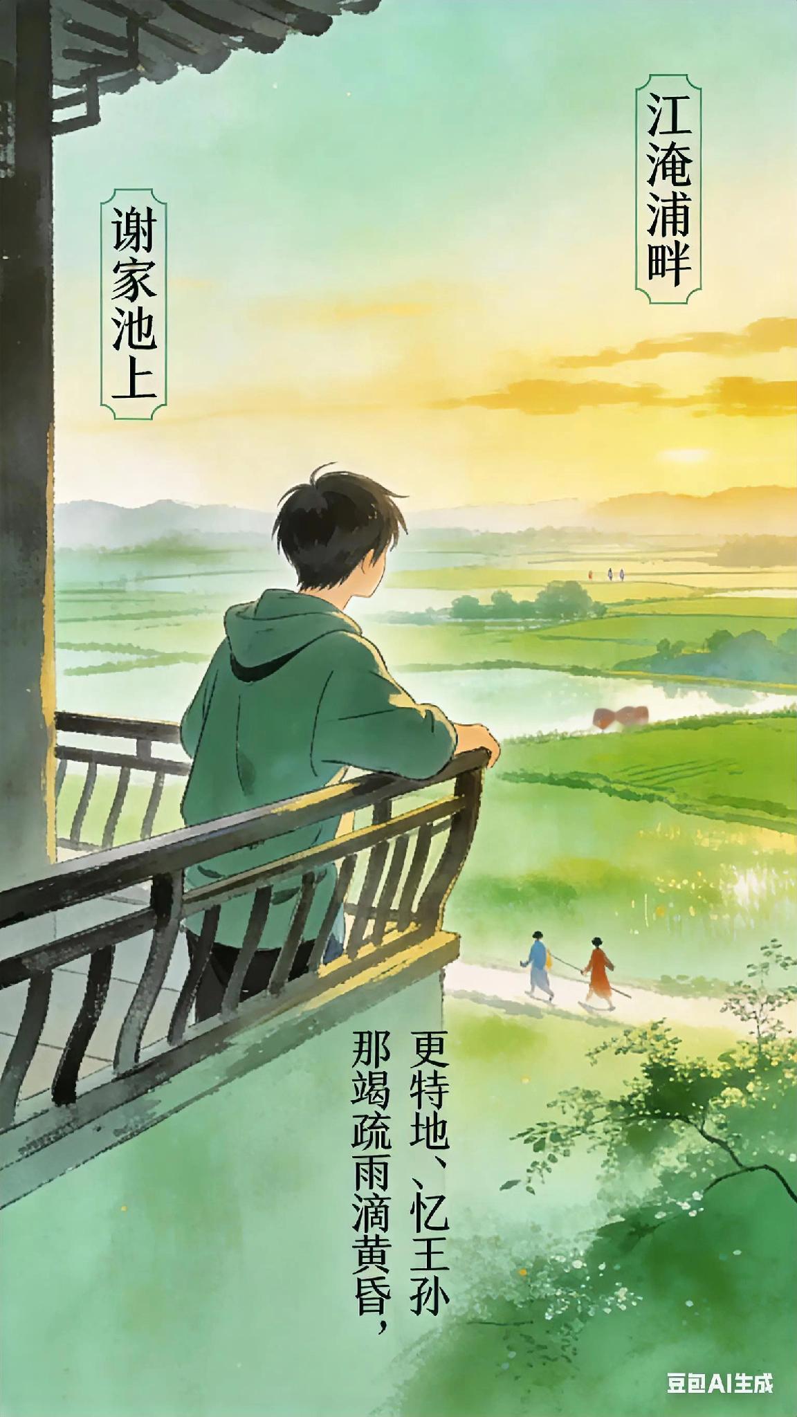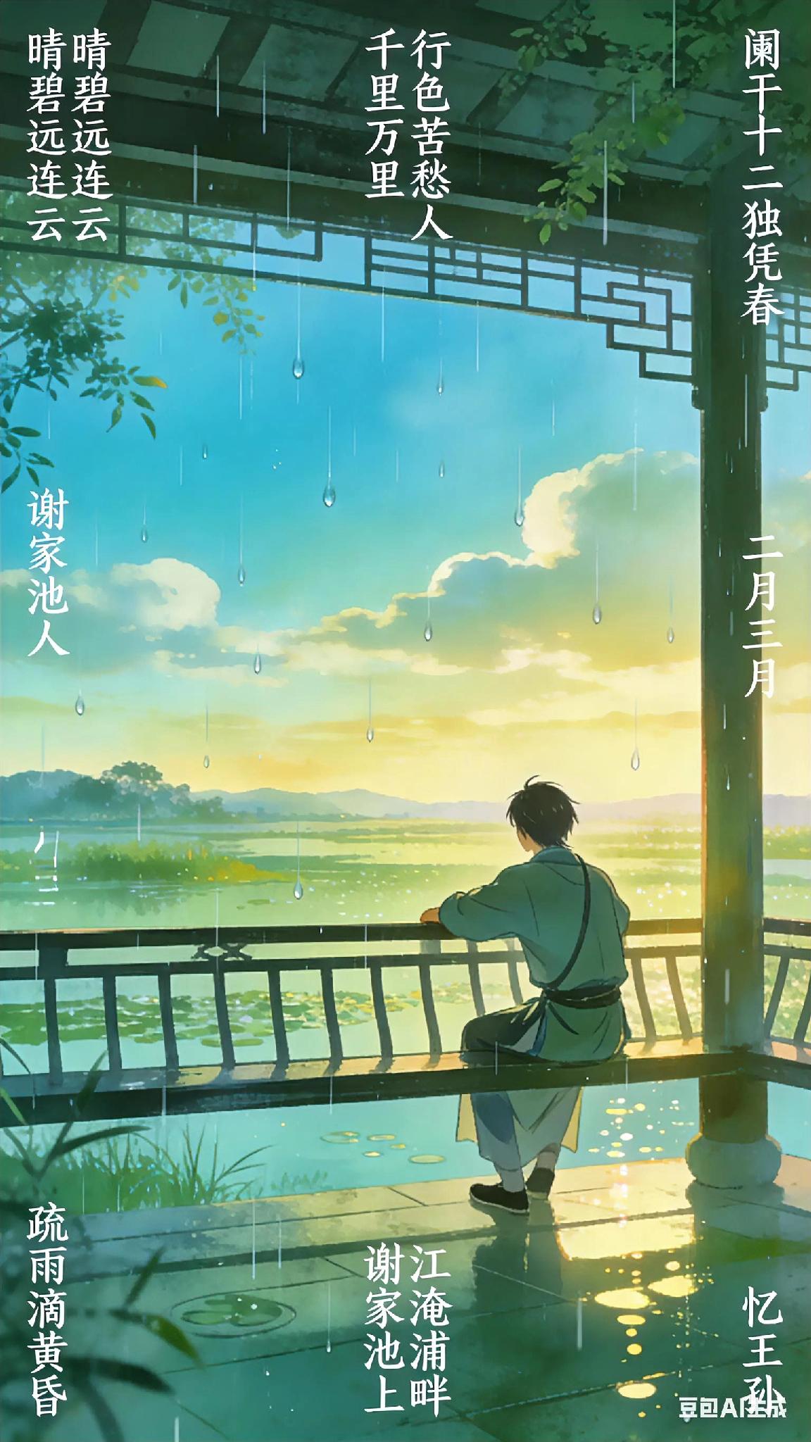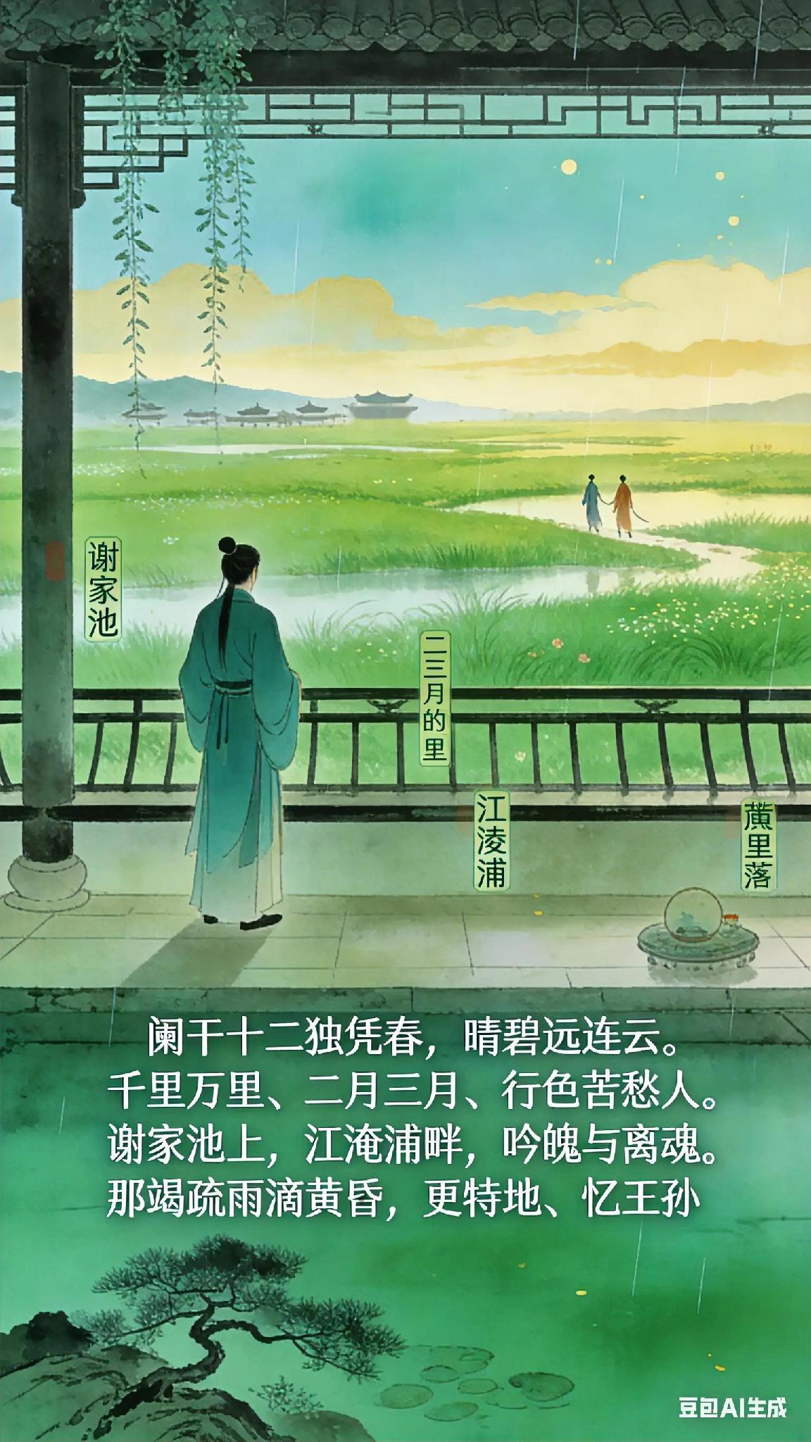 《少年游》宋、欧阳修。 阑干十二独凭春, 晴碧远连云。 千里万里、 二月三月、 行色苦愁人。 谢家池上, 江淹浦畔, 吟魄与离魂。 那竭疏雨滴黄昏, 更特地、 忆王孙。 《少年游》现译: 我独自倚遍十二道阑干眺望春色,晴空下碧草绵延至天边。 在这二三月间,目送游子跋涉千里万里,漂泊的愁容令人心碎。 眼前谢家池塘与江淹送别的江岸,仿佛看见诗人徘徊吟咏的孤影。 当稀疏雨滴敲打黄昏,那声声分明在呼唤——远方的浪子何时归来? 少年必读古诗 少年游歌曲 欧阳修长相思 七律·少年行 古诗词 你记得最深的一首古诗词是什么