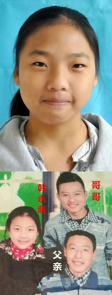 随手寻亲超话家寻宝贝寻2002年2月14日生2016年11月9日在河南许昌鄢陵县彭店镇放学路上失踪的女孩韩永萌,大眼,高鼻梁,右中指有冻疮痕,膝盖下有摔伤痕。家离校较远,平日周末家人去接,失踪当日校方临时放假,她与同学结伴回家分开不久她后失踪。父韩振平,哥韩永兵(AB型血),嫂韩彦华。 网页链接