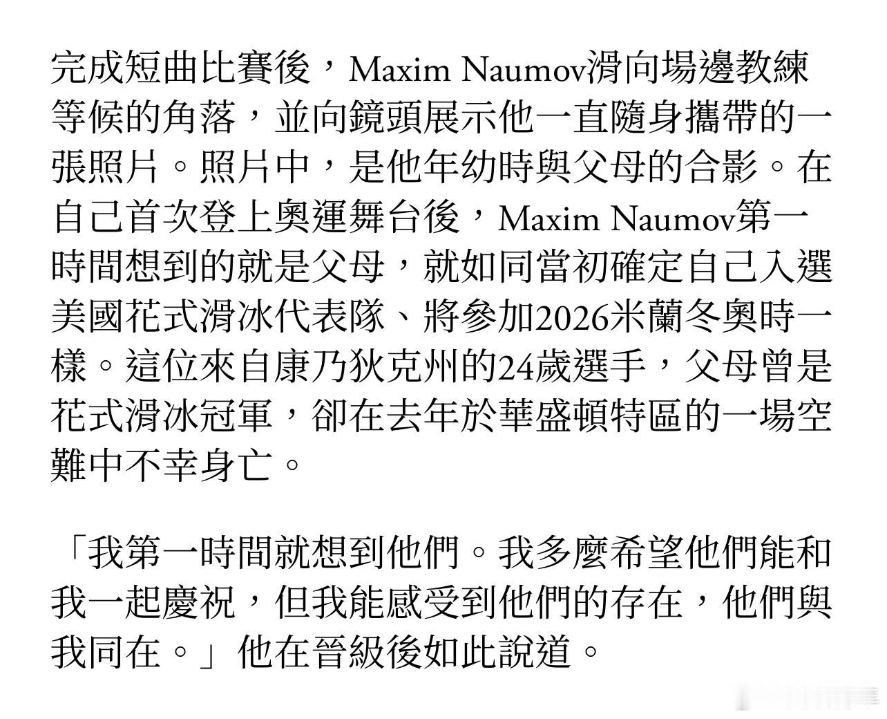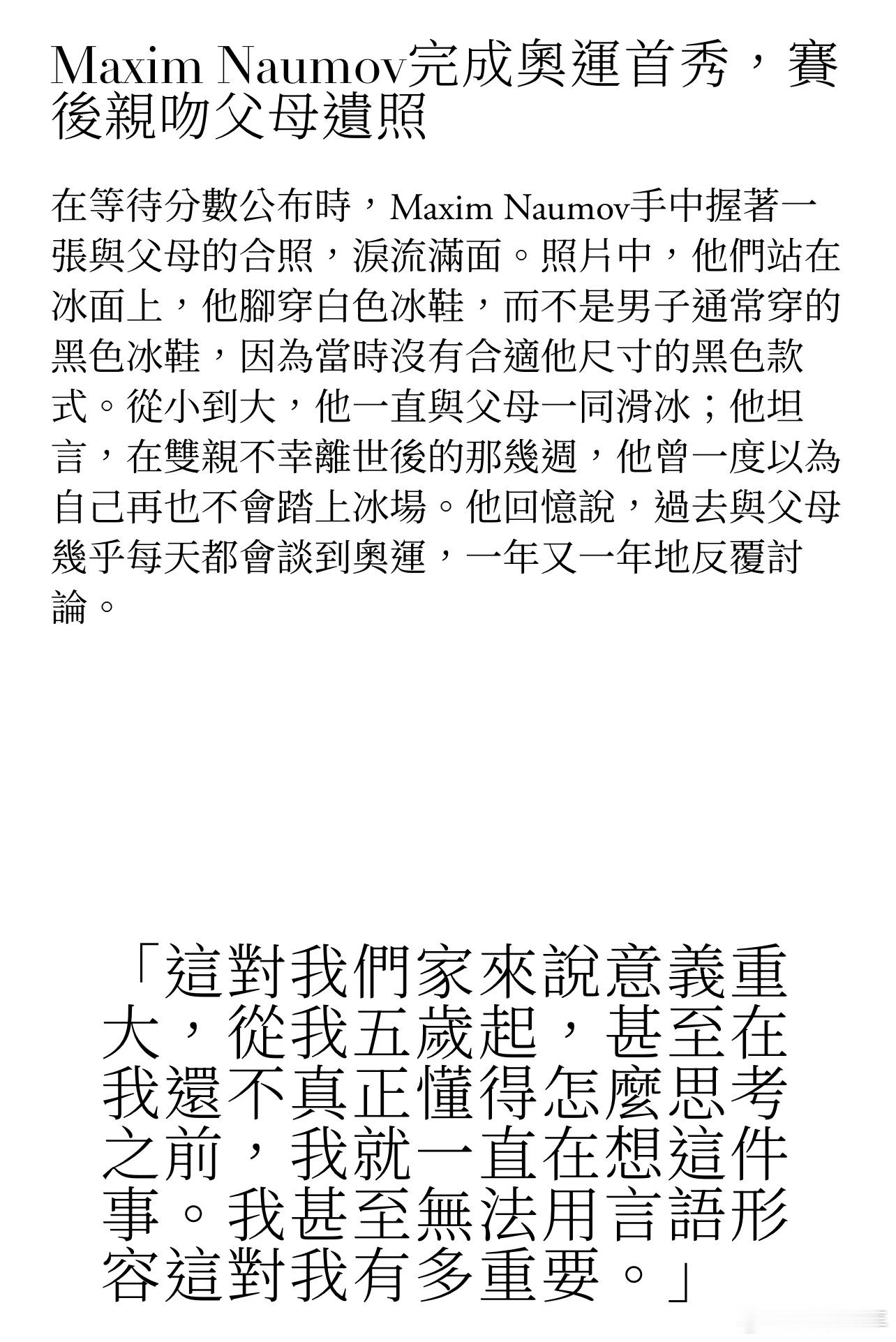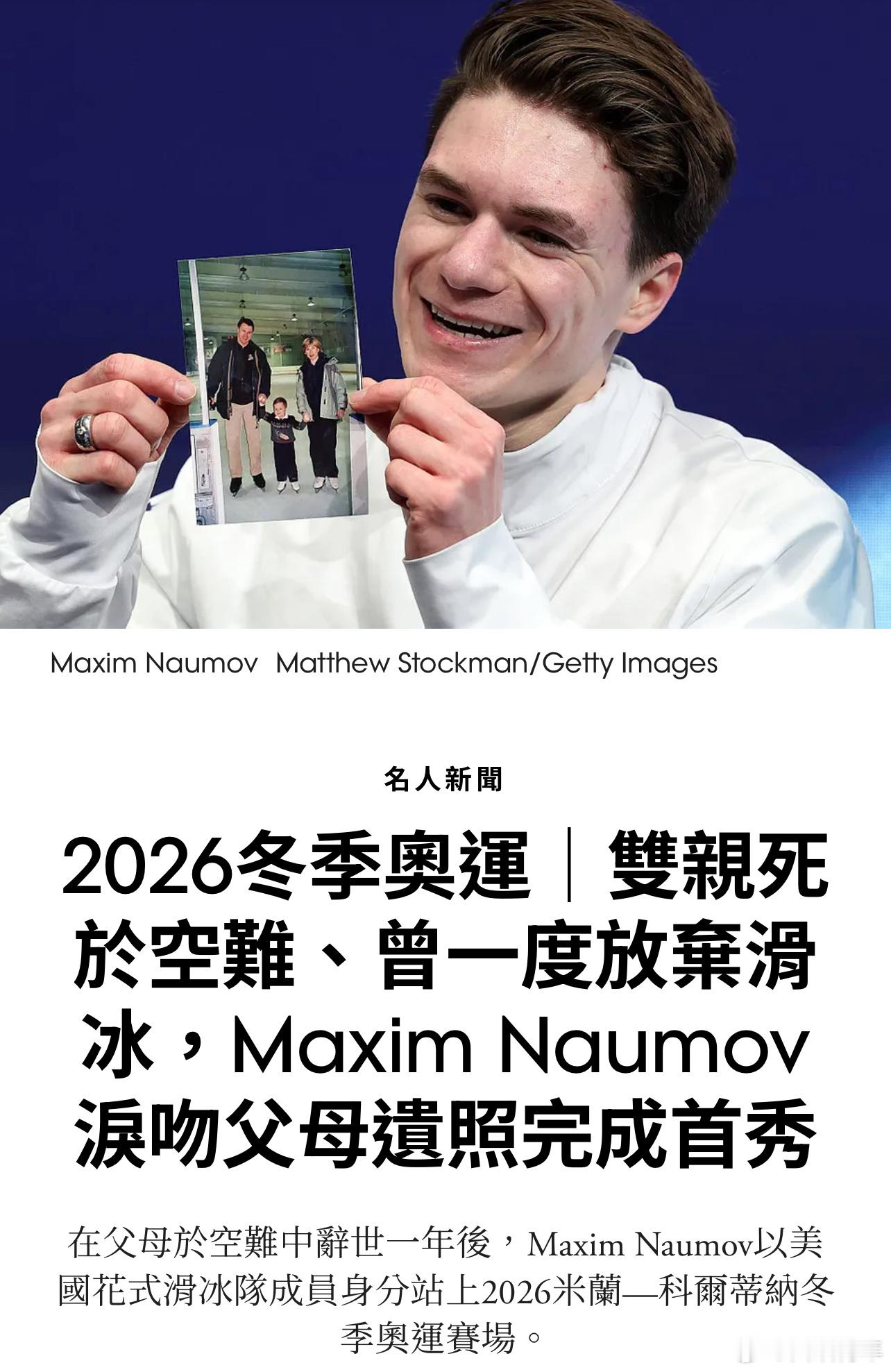 登上冬奥会舞台的选手Maxim,面对镜头含泪亲吻父母的遗照。“我第一时间就想到他们。我多么希望他们能和我一起庆祝,但我能感受到他们的存在,他们与我同在。”