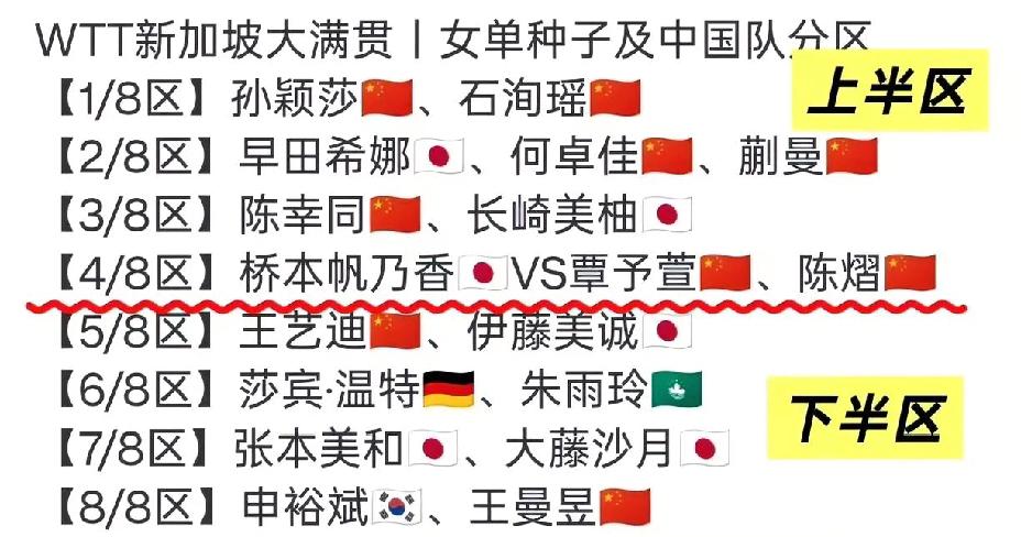 新加坡大满贯女单签位是被“做局”了吗? 国乒女队9人参赛7人在上半区, 上半区不仅要内战还要打削球手, 这签位不是一般的硬。 新加坡大满贯签位已出, 女单签位真是让人唏嘘不已。 怎么会这么硬呢? 9人参赛7人在上半区, 这不是捅了“马蜂窝”了吗? 网友直呼中彩票概率这么大就好了。 小将覃予萱好不容易参加一次大满贯, 一上来就遇到桥本帆乃香, 这是替她捏把汗。 其实女队外协最强的就是日乒那几个, 剩下的就是内战最难。 谁成想新年第一战就是一连串的内战, 上半区7个人必须要淘汰6个人, 下半区只有大迪和王曼昱2个人, 女队这次真是扎堆上半区了, 这签位也不知道是怎么回事? (图片源自于网络)