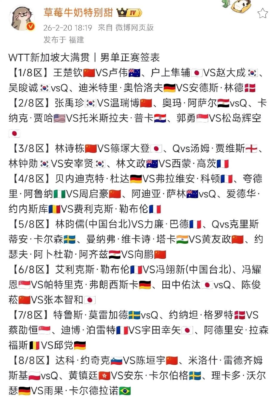 新加坡大满贯男单签表, 还是相对不错的, 至少没有堆在一起, 比女单签表均匀多了。 唯一遗憾的是小石头和王楚钦在上半区, 他们两个人只有一个人能进决赛。 这次新加坡大满贯男队签表还是不错的, 分配的比较均匀, 不像之前那么“扎堆“了。 可是面对外协的第一轮就不太友好了, 温瑞博上来就遇到张禹珍, 陈俊崧上来就要打张本智和, 陈垣宇上来就要对战达科, 对于年轻小将来说确实有挑战性。 另外林诗栋世界排名落到第三位之后, 直接和他头哥分到了上半区, 也就是说他们两个只有一个人能进决赛。 虽然男队签表不扎堆, 可是要想都打出来还是有一定难度。 所以说比赛签位好固然重要, 最重要的还是要实力强才可以。 有网友表示, 本次新加坡大满贯的签位, 比春晚还要好看。 (图片源自于网络)