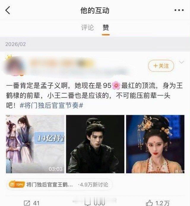 将门独后导演尹涛点赞孟子义一番的微博,原文还说王鹤棣二番是应该的,这是在为女主发