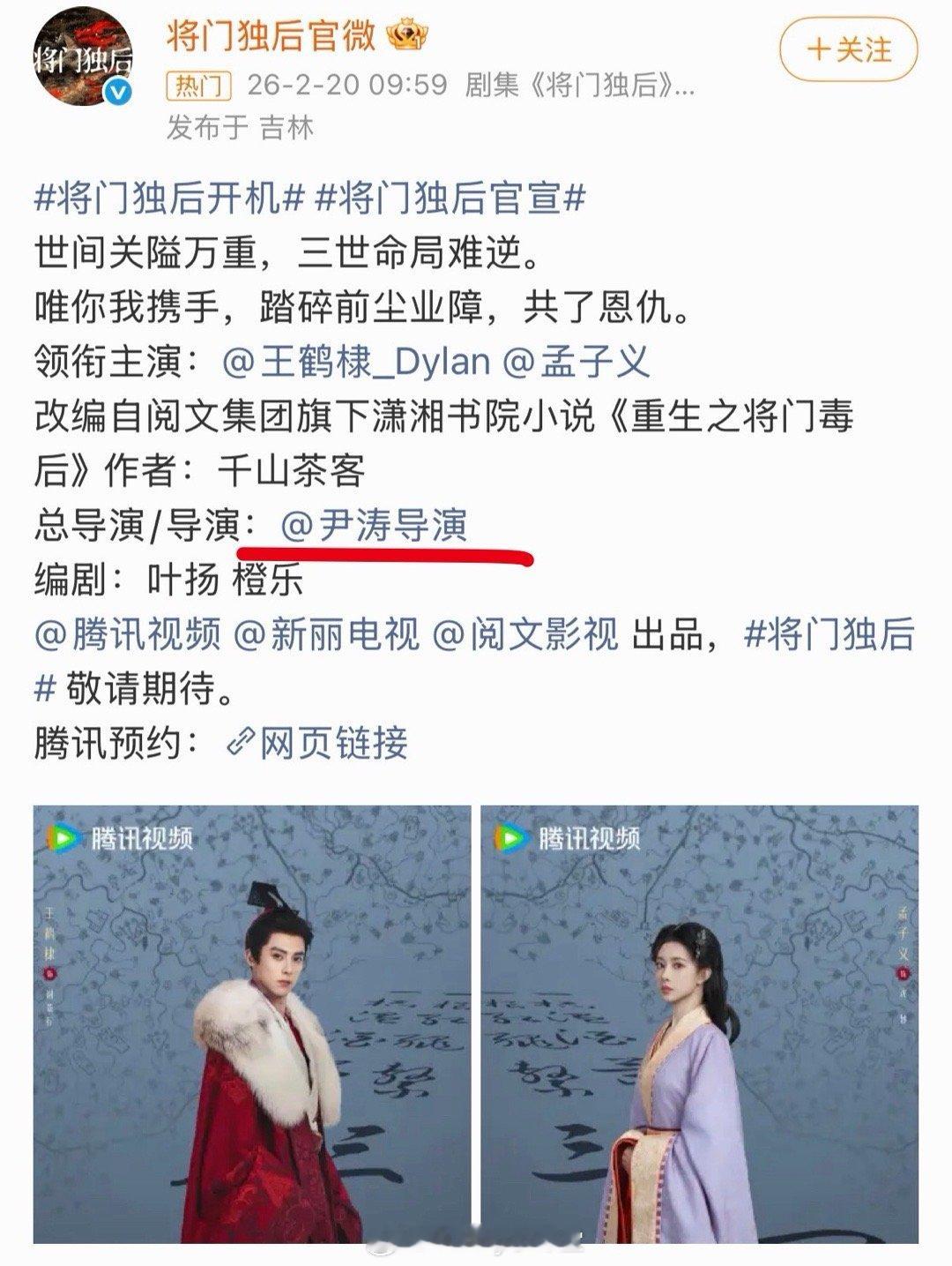 将门独后导演尹涛点赞孟子义一番的微博,原文还说王鹤棣二番是应该的,这是在为女主发声吗