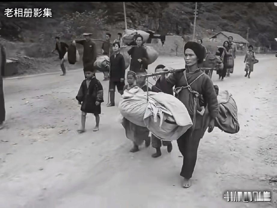 老一辈人,实在是太可怜了[流泪] 朋友们,你现在看到的,是1945年广西大逃难的真实照片。 镜头里,这位母亲赤着脚,用一根扁担挑起全部家当,背上背着一个小的,身后还跟着四个半大的娃。 他们衣衫破烂,神情疲惫,却一步一步,在土路上硬撑着往前走。 在他们身后,是一眼望不到头的逃难队伍。 那一年,日军打过来,桂林、柳州都沦陷了,几百万老百姓被迫离开自己的家,靠两条腿往贵州、云南方向逃。 路上没吃的,没药,还有飞机轰炸,好多人就这么没了。 这张照片,没有硝烟,却比任何战场都让人揪心。 它告诉我们,和平,真的是用无数人的苦难换来的。