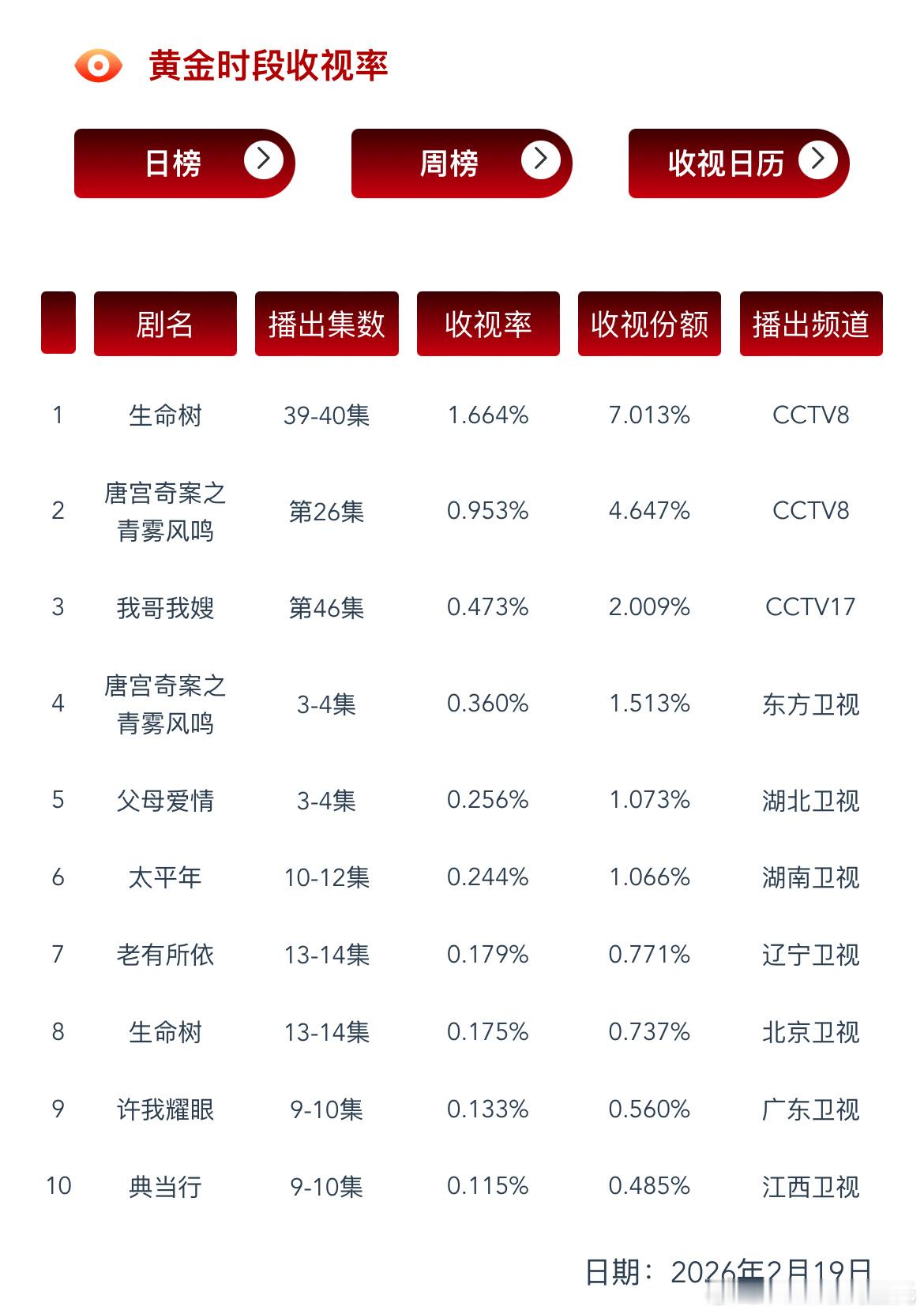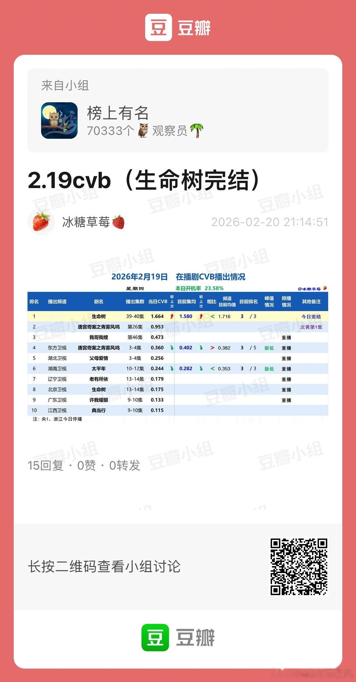 2.19CVB收视率生命树 完结,集均1.58%,远低于台均1.7%+,寒假档+春节档叠buff都救不回哈哈哈哈,之前被嘲的流量花粉们深刻领会啥是回旋镖了 。