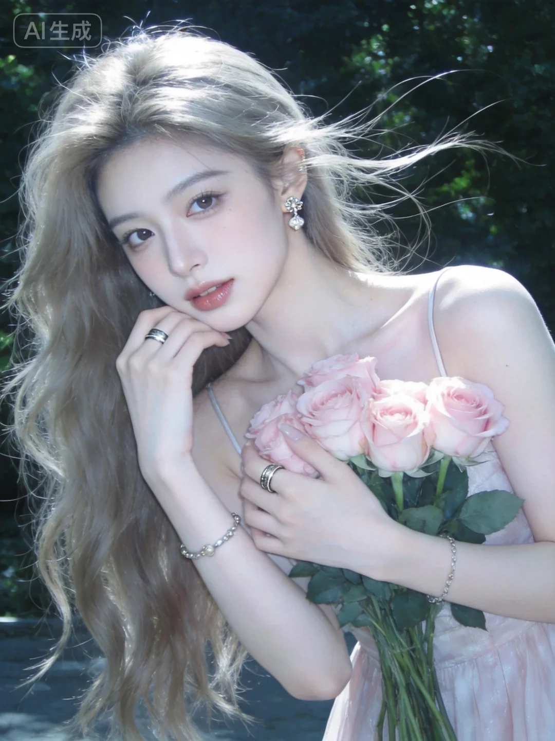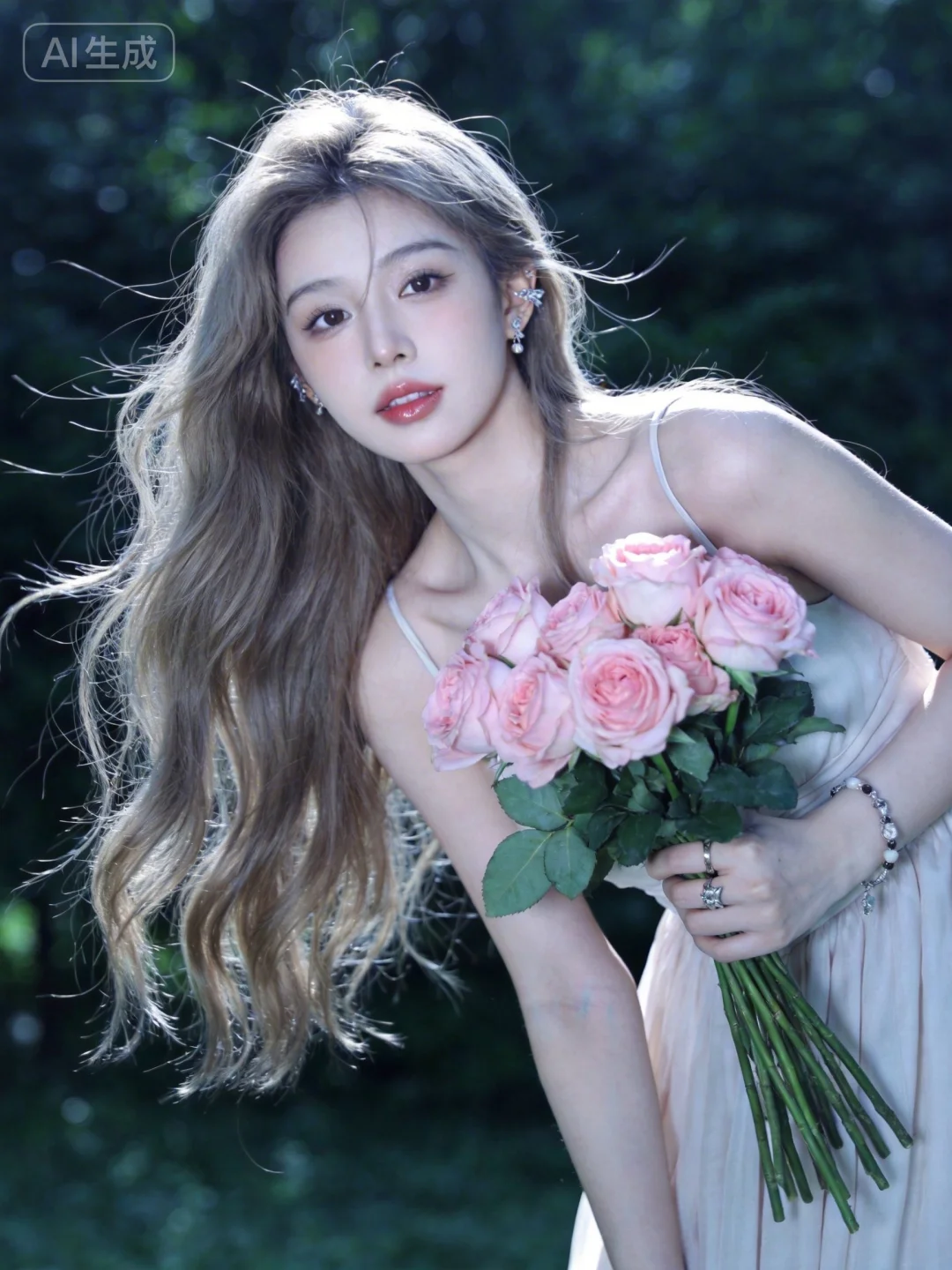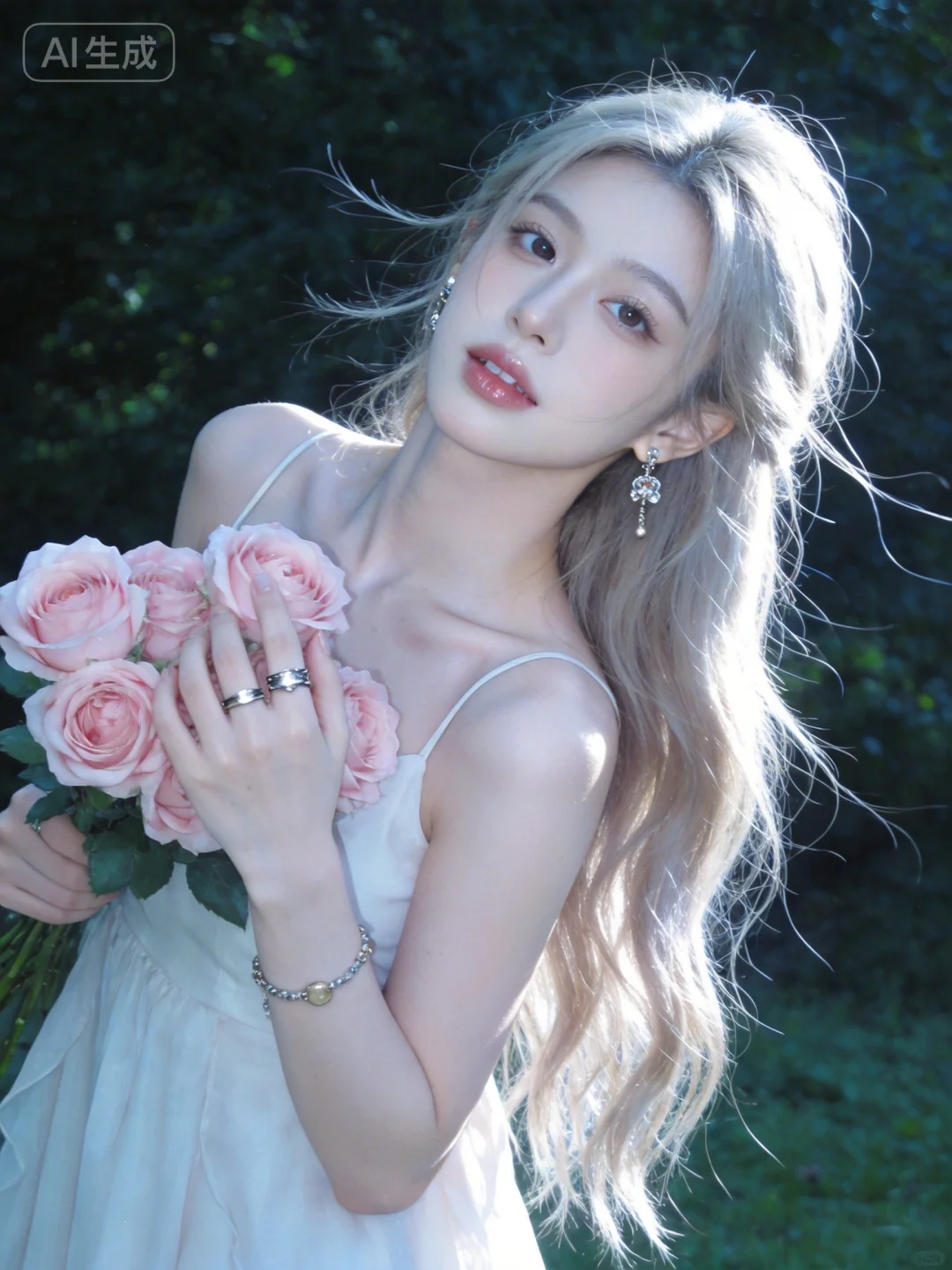 真实摄影,头部特写,亚麻色长发,佩戴耳饰、手链、戒指,身穿吊带长裙,手持粉色玫瑰花束,背景是户外绿意,整体风格优雅、浪漫,充满鲜花结合的氛围感,(电影级面光:1.6),(光线追踪:1.5),(冷白皮漫感质感的光滑皮肤:1.7),(人物有最好的骨相:1.2),(网感脸:1.6),(网感妆:1.6)身材完美,莫兰迪配色,高颜值网红,INS风,幼态脸,19岁女生尖下巴,三庭五眼比例均衡,身材娇小,细腻陶瓷水嫩肌肤,偏冷白皮,随机的妆容,随机的饰品,随机的动作,侧光,发丝轻飘,凌乱,随机角度拍摄,总体有很多的不确定性,但又好看,