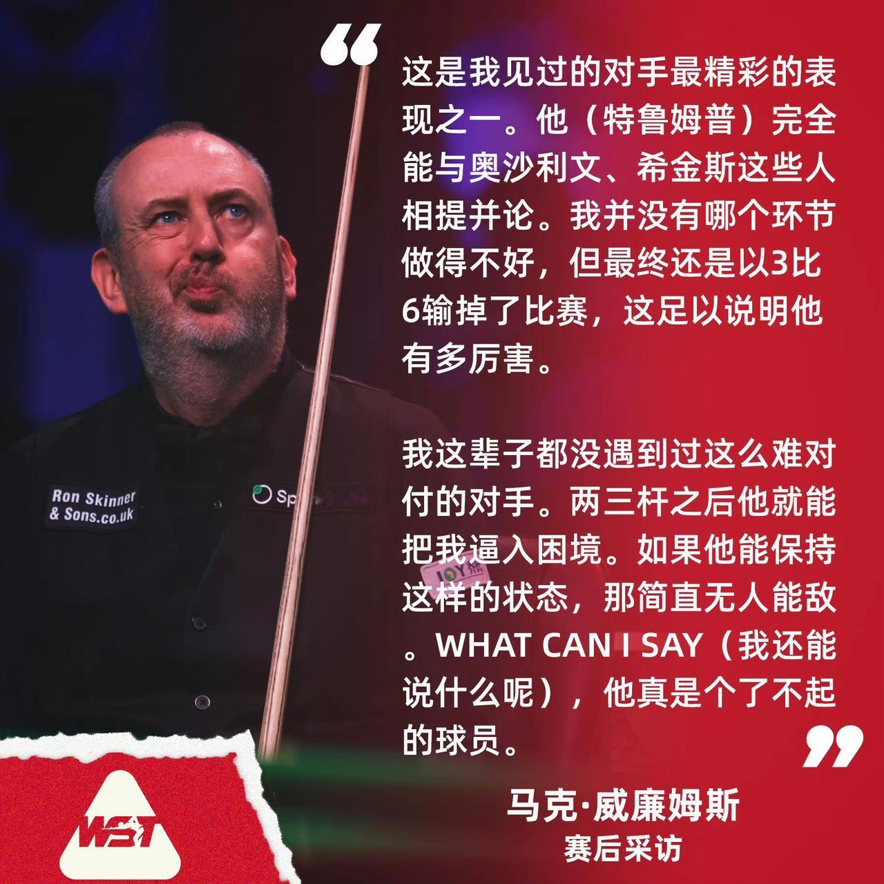 希金斯认为特鲁姆普完全有资格成为斯诺克旗手,但小特坦言自己性格安静、不愿抛头露面,难以抢夺公众关注。 特鲁姆普解释自己为何未能拥有奥沙利文那样的巨星魅力。他表示这并不意外,因为自己缺乏"摇滚明星式的生活方式":"我不抽烟,不吸毒,不做任何类似的事情。我的家人把我教育得太好了,不会去做那种事。" 马叔也认为特鲁姆普完全能与奥沙利文相提并论。