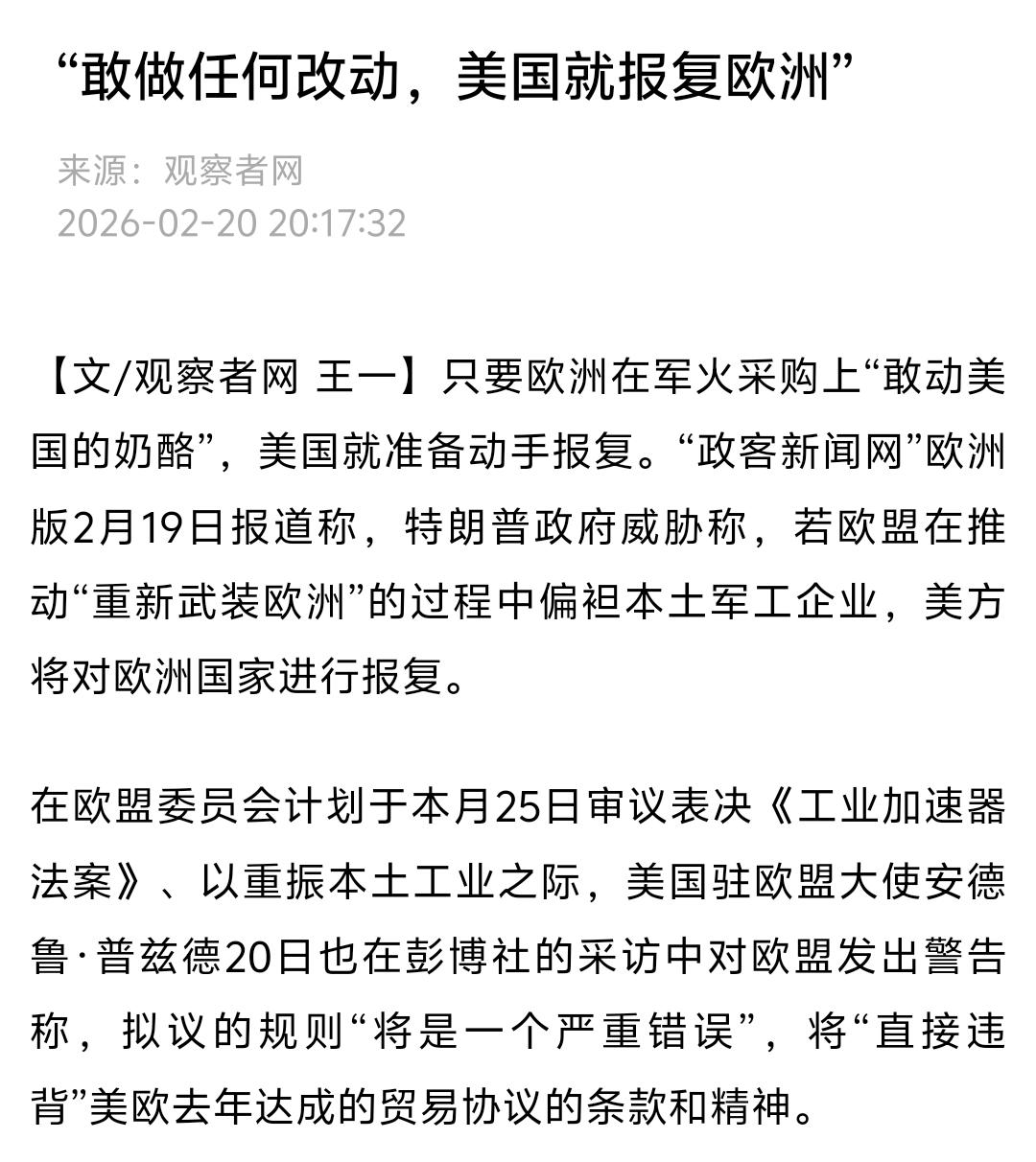 这是不是太霸道了?美国可以借“美国优先”对其他国家加征关税、出台各种限制措施,但欧洲借“欧洲优先”要求购买欧洲货就不行!美国国防部甚至发出警告称,若未来欧盟采购立法纳入强制性的“购买欧洲货”条款,美方将采取报复措施。这叫什么?美国可以“做初一”,欧盟不能“做十五”!想想也是哈,如果北约成员国加大军费预算却都买了欧洲货,那美国督促他们增加军费不就白忙活了一场?