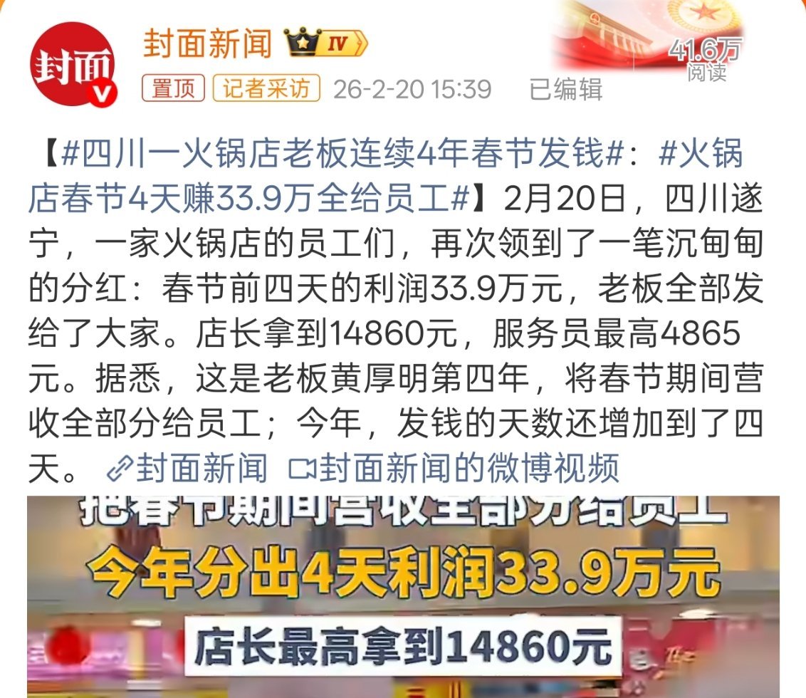 火锅店春节4天赚33.9万全给员工说实话,春节谁上班都不会高兴,但是如果钱到位,起码心里也有个安慰,也能对公司更有归属感。