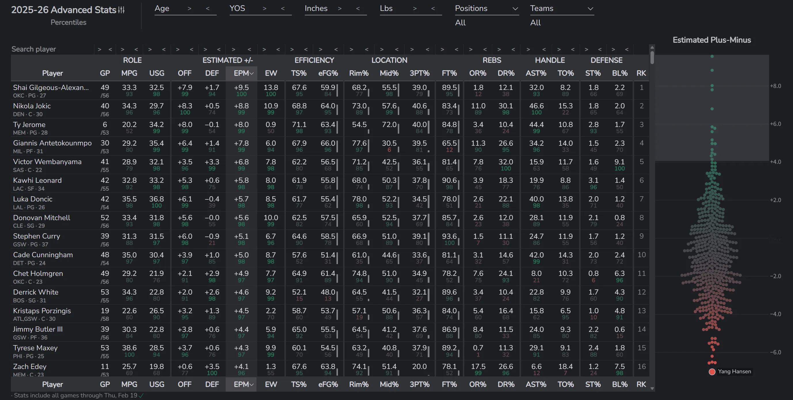 亚历山大继续领跑EPM榜,与约基奇的差距拉开了,切特也排名前列,值得一提的是杨瀚森目前联盟倒数第一。