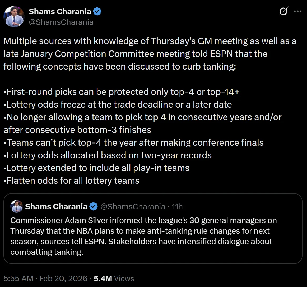 多位了解周四总经理会议及1月下旬竞赛委员会会议的消息人士向 ESPN 透露,联盟已就以下遏制摆烂的方案展开讨论: