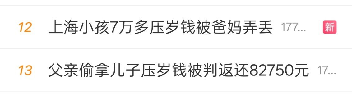 上海小孩7万多压岁钱被爸妈弄丢不是,连续两个热搜,压岁钱都是七八万,那我小时候的七八百算啥,而且还必须还给我妈。