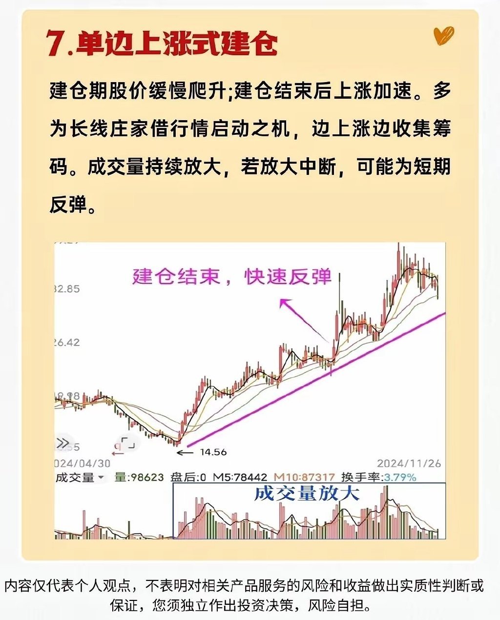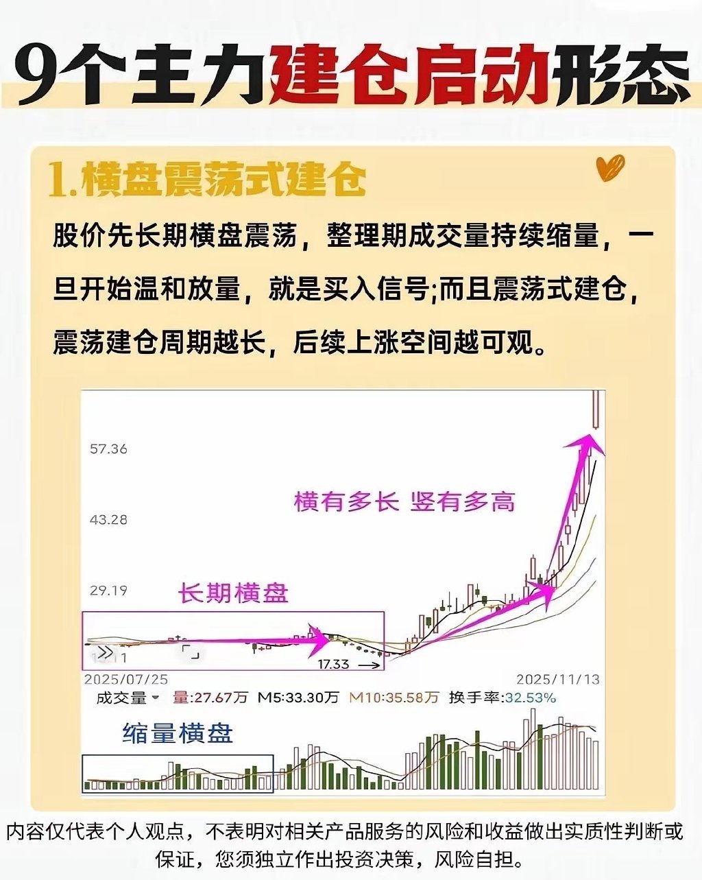 主力建仓、启动行情,其实是有明显形态的,看懂了就能少踩坑、多抓机会。先说最常见的挖坑形态。主力想拿筹码,会先故意把股价打下去,制造恐慌,让散户忍不住割肉。比如一只股票本来走得好好的,突然连续大跌收出大阴线,但成交量并没有明显放大,这多半就是主力在“挖坑”洗盘。等筹码洗得差不多了,股价很快就会拉回去,甚至走出一波行情。再说说平台突破形态。一只股票在一个区间里横盘震荡很久,成交量慢慢变小,说明浮筹越来越少。某一天突然放量大涨,突破横盘区间的上沿,这就是主力要启动的信号。尤其是质地不错的股票,长期横盘后一旦突破,后面上涨空间通常都比较大。看懂这些主力常用的形态,就能更大概率跟上主力节奏,抓住启动前的机会。a股财经