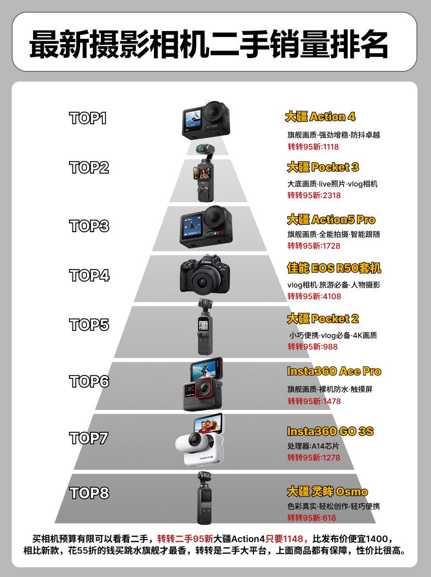 最新摄影相机二手销量排行榜。大疆pocket3 大疆action4大疆action5pro佳能eos数码科技 相机相机推荐大疆pocket2binsta360acepro