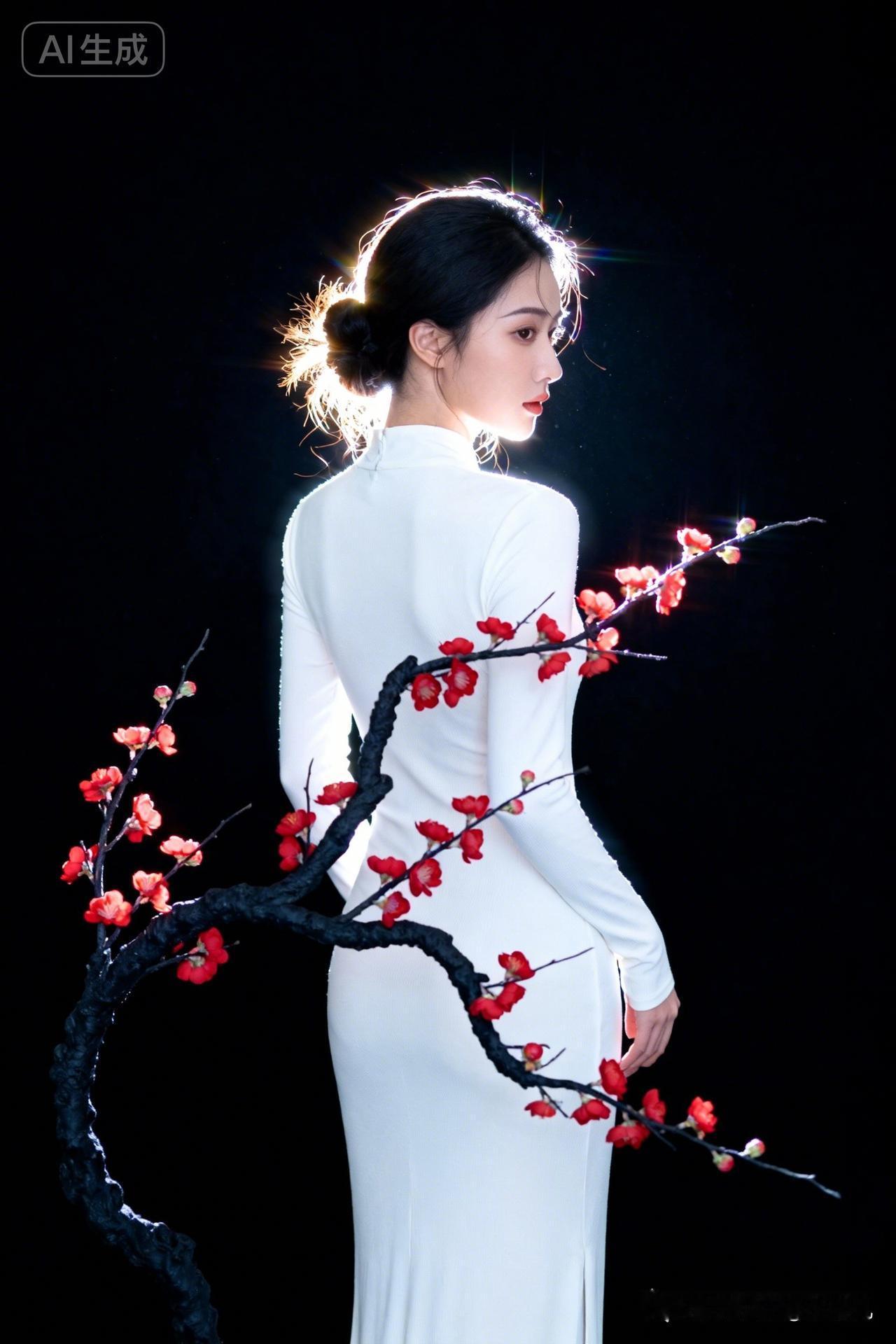 前景红梅枝自左下向右上舒展,红花疏密有致。美女低发髻慵懒蓬松,白修身长裙侧身回眸,禅意空灵。黑哑光柔焦背景,生物轮廓光勾勒发丝,新中式极简,梦幻高级,高清质感。