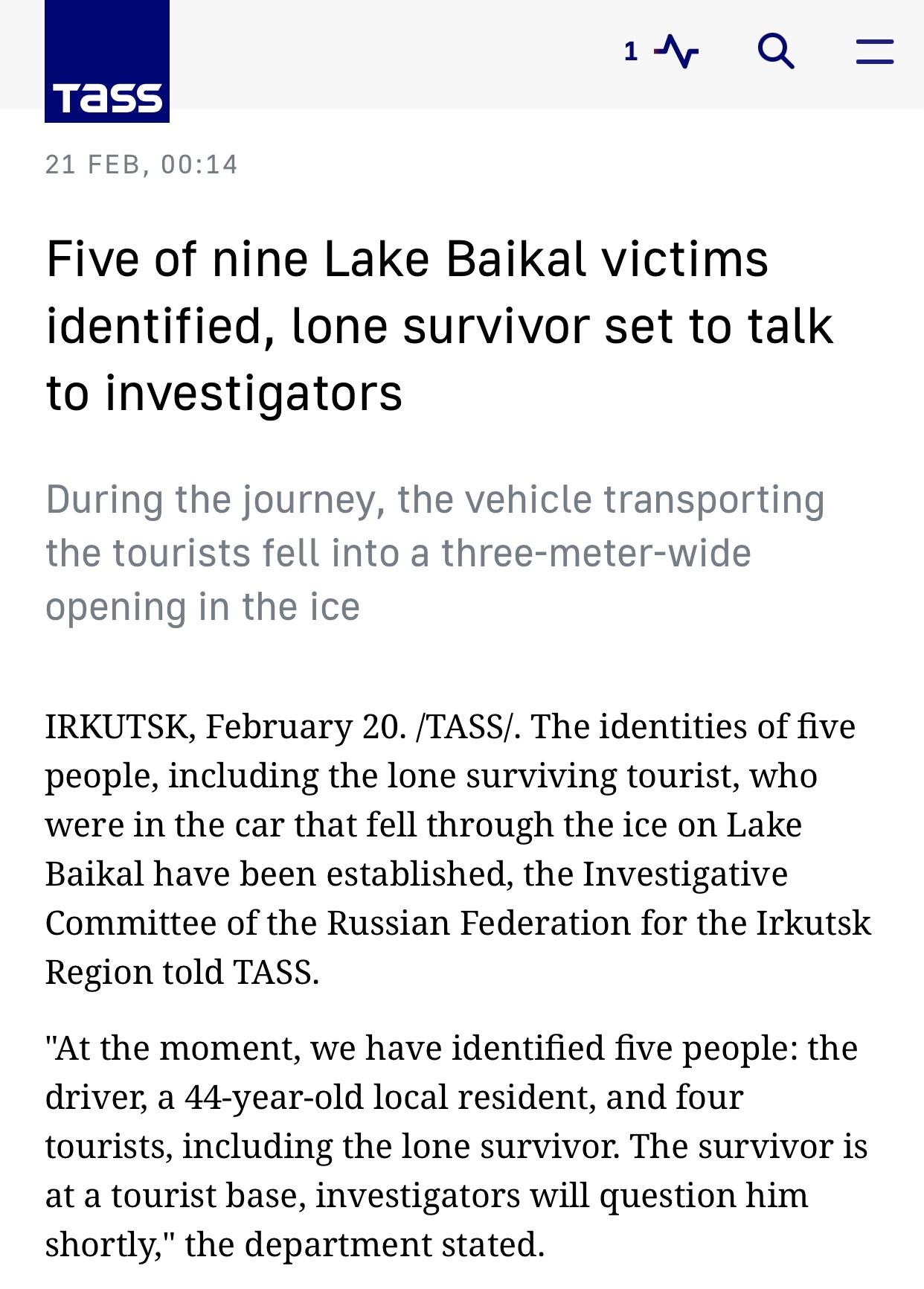 塔斯社:贝加尔湖遇难中国游客中包括一名14岁孩子 俄伊尔库斯克州立案调查”非法活动” 塔斯社伊尔库茨克2月20日电:伊尔库茨克州州长伊戈尔·科布泽夫告诉塔斯社,在贝加尔湖上驾车坠入冰窟窿不幸遇难的中国游客中,包括一名14岁儿童。 “目前,已确认五人的身份:司机是一名44岁的当地居民,另外四名游客,其中包括一名幸存者。这是一个来自中国的家庭,他们的信息是在酒店登记中发现的:一对已婚夫妇、他们14岁的孩子和另一名亲属。他们都是以个人游客的身份抵达的”,科布泽夫说道。 报道说,车辆掉进18米深、3米宽的冰裂缝中。使用水下摄像机已找到七具尸体。一名乘客幸存。这位州长提醒,由于天气转暖,冰上驾驶禁令已生效,通往奥尔洪岛(Olkhon Island)的冰路已关闭,并敦促游客避免与未注册的导游接触,官方承诺将调查这些导游的非法活动(whose illegal activities the official promised to look into)。 报道说,伊尔库茨克地区已就贝加尔湖冰面发生的事件立案,该事件导致一群游客死亡。2月20日下午,一辆载有9人的”瓦兹”(UAZ)越野车在霍博伊角(Cape Khoboy)地区不慎坠入贝加尔湖冰面下。 根据初步数据,此次事件造成了人员死亡。基于此事实,俄罗斯伊尔库茨克州调查委员会的调查机构,已根据《俄罗斯联邦刑法典》第238条第3部分(提供服务未达到安全要求,因疏忽导致两人或两人以上死亡)和《俄罗斯联邦刑法典》第293条第3部分(疏忽)所规定的罪行,对此事启动了刑事调查。 报道的原标题是《Child present among Chinese tourists who died on Lake Baikal》(在贝加尔湖死亡的中国游客中,有孩子在场)。 另据塔斯社2月20日电、2月21日发布的报道:俄罗斯联邦伊尔库茨克地区调查委员会向塔斯社透露,唯一幸存者目前身处一个旅游基地,调查人员将很快对他进行问询。 报道说,该地区调查委员会报告称,20日下午3点左右(当地时间,格林尼治标准时间上午7点),一辆载有游客的汽车从奥尔洪斯基区胡日尔村的一个旅游基地出发,驶向贝加尔湖冰面上的霍博伊角。车上载有1名司机和8名游客。事故导致8人死亡,包括司机和7名乘客。 报道说,在旅途中,运载游客的车辆掉进了冰面上一处三米宽的裂缝中。据紧急情况部称,事故发生地点的冰层深度达18米。在悲剧现场,使用水下摄像机发现了7名遇难者的遗体,并已对此事立案。据俄罗斯旅行社协会称,这些中国游客并非通过旅行社安排此次旅行,而是直接与当地居民协商行程的。 报道的原标题是《Five of nine Lake Baikal victims identified, lone survivor set to talk to investigators》(贝加尔湖沈船事故九名遇难者中五人身份已确认,唯一幸存者将接受调查人员问话)。