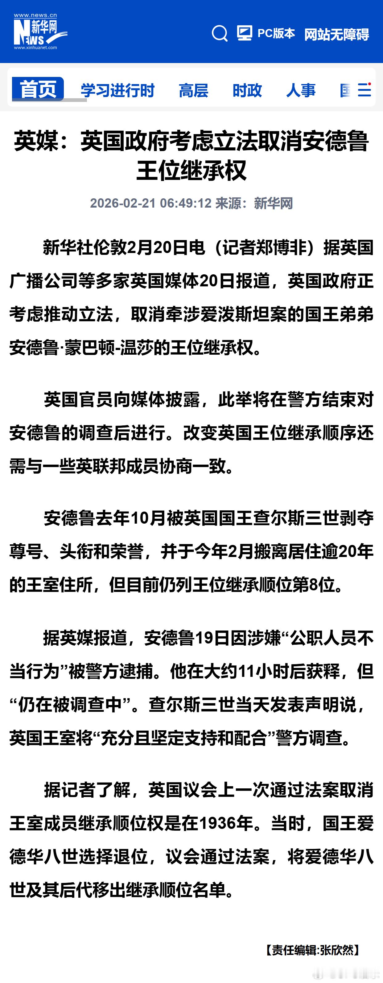 英媒:英国政府考虑立法取消安德鲁王位继承权