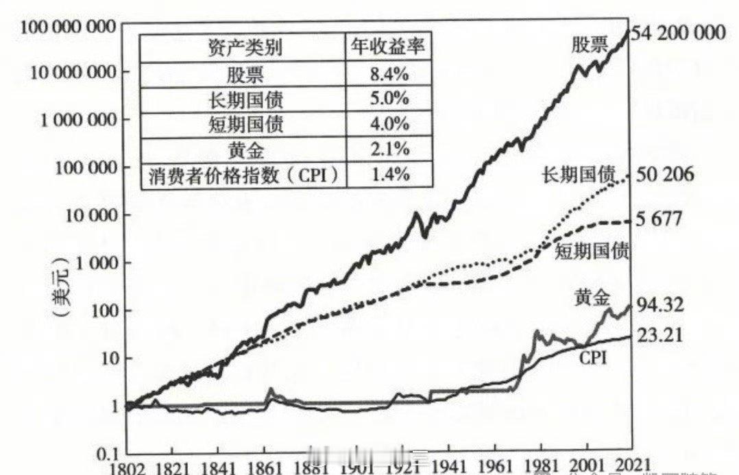 a股 家庭资产中,为何股市配置不要太低?根据沃顿商学院教授杰里米・希格的研究,1802-2021年期间,扣除通胀后股票的年化收益率能到 8.4%,远超长期债券的 5.0% 和黄金的 2.1%。