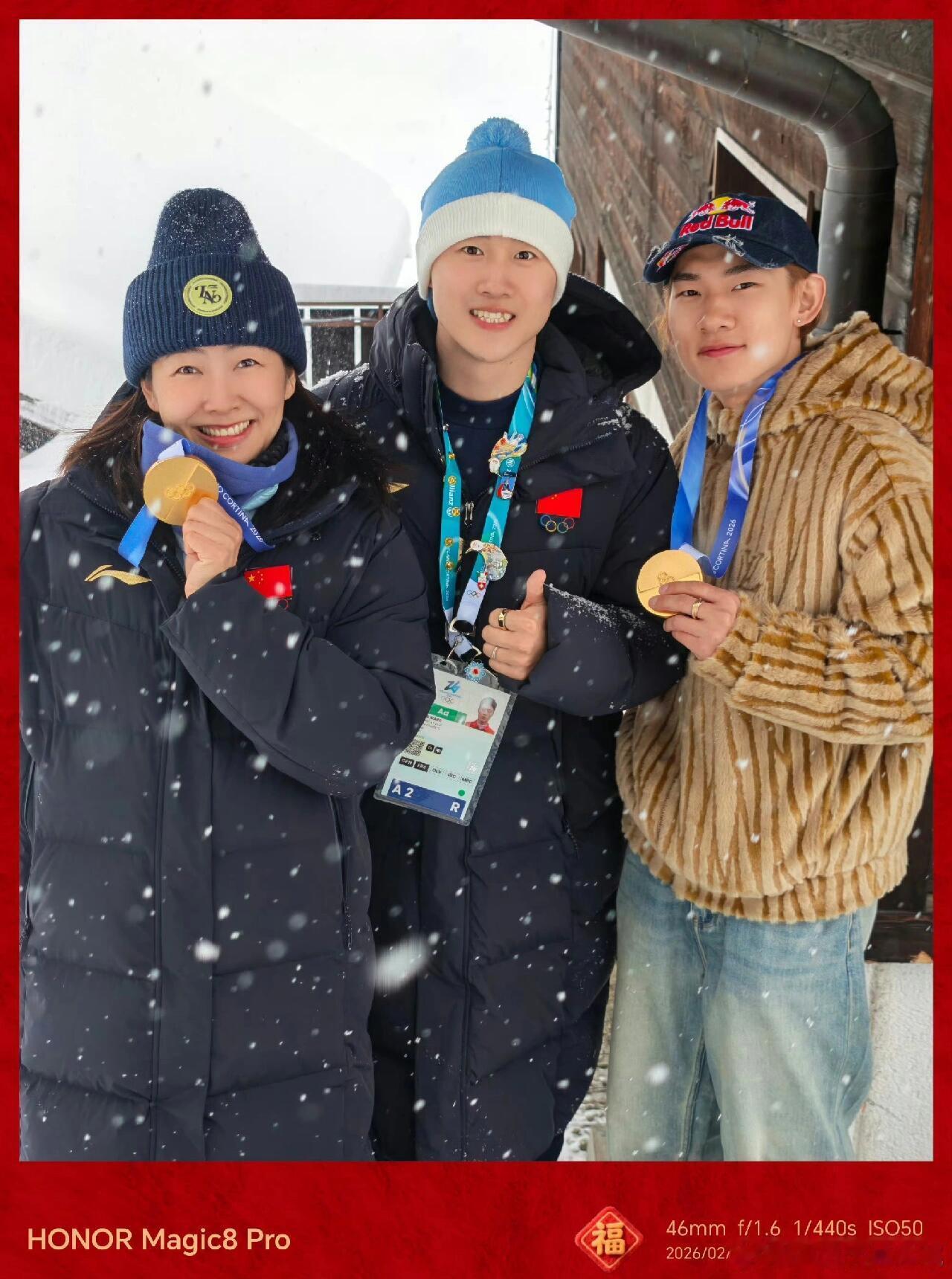 徐梦桃、王心迪、苏翊鸣三位冠军合影。苏翊鸣继续展示广告位身穿LV竖条纹外套和卡地亚戒指💍