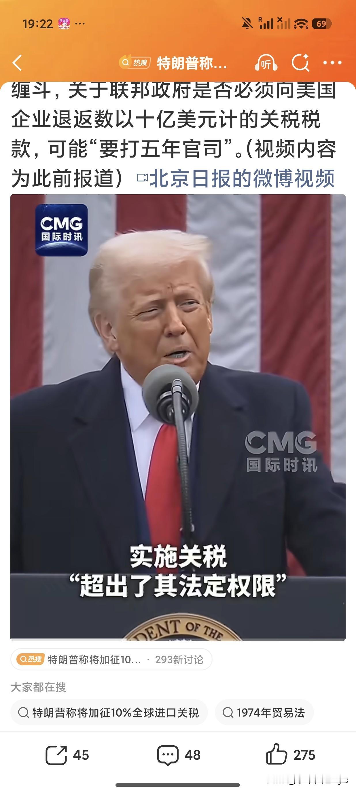 北京日报据新华社消息,美国总统特朗普20日在一场白宫记者会上称,他将签署行政令,对全球商品加征10%的进口关税,为期150天,以取代稍早前被美国最高法院认定违法的一些紧急关税。 这是一条关于美国贸易政策因最高法院裁决而被迫“紧急换道”的重要新闻。简单来说,特朗普政府先是在最高法院遭遇重大司法失败,原有的关税政策被判违法,但他随即启动备用法律,试图用另一种方式延续“全球关税战”。 特朗普此前主要援引《国际紧急经济权力法》(IEEPA)来征收大规模关税,其逻辑是“宣布国家紧急状态”从而绕过国会。但最高法院在2月20日以6比3裁定,IEEPA并未授权总统征收关税,明确征税权属于国会。这意味着他通过该法征收的约1750亿美元关税面临非法风险。 在被裁定违法后仅数小时,迅速切换法律依据,加征10%全球关税。特朗普宣布签署新行政令,依据《1974年贸易法》第122条出牌: 税率与范围:在现有常规关税基础上,额外对全球所有国家加征10%的进口关税。 生效时间:预计在约三天内(即2月23日左右)生效。 核心限制:与之前不同,此条款下的关税最多只能持续150天。除非国会批准延期,否则届时将自动失效。 1750亿美元要退吗? 关于此前依据IEEPA征收的巨额关税是否退还,目前是法律博弈的焦点。 特朗普的态度,他暗示这笔钱可能不会退,预测此事将引发长达五年的官司。 企业不依不饶,已有超过1500家企业提起诉讼要求退款,包括Costco等大型零售商。 关税战并未结束,只是换打法! 特朗普明确表示,这只是一个开始。他保留了之前的钢铝关税(232条款),并计划启动新的“301调查”(针对具体国家的不公平贸易行为)。这表明,即便短期法律路径受限,其通过关税施压的贸易保护主义策略并未改变。 最高法院的判决,对特朗普来说是一个挫败,不仅他的关税政策失败,而且对他余下的时间留下诸多隐患,他民意支持率会更低,民主党的制约力度会更大,施政将更加困难。特别是面临中期选举,负面影响难以估量,此次事件可能会增加民主党胜率,而一旦民主党赢得中期选举,接着就会弹劾特朗普。这也是特朗普最担心的,一旦被弹劾,在剩余任期内,他将举步维艰。或者被清算,结束政治生命。 现在的特朗普要孤注一掷了。