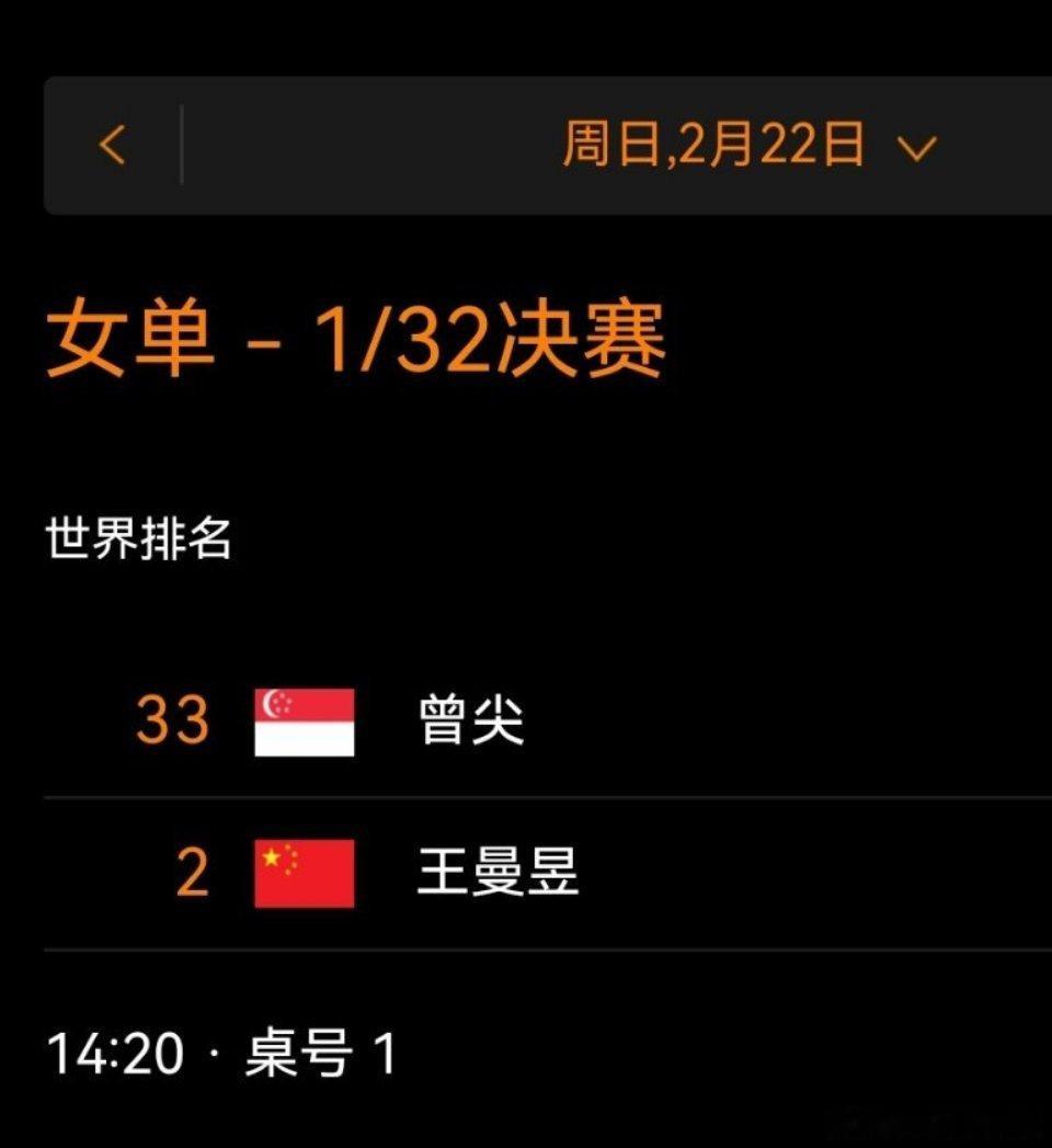 WTT新加坡大满贯2026新加坡大满贯女单1/32决赛2月22号 14:20,T1王曼昱vs曾尖 王曼昱加油健康完赛!