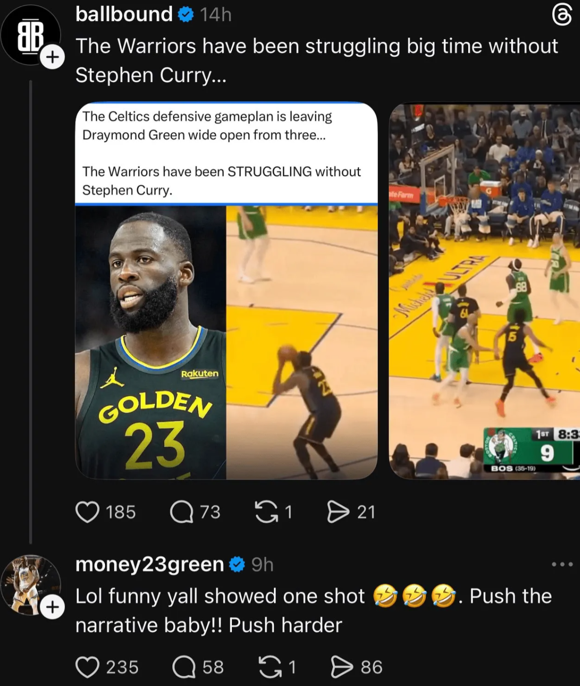 昨日NBA常规赛勇士主场对阵凯尔特人的比赛已经结束。全场战罢,勇士以110-121不敌凯尔特人。 据NBA Central报道,账号ballbound发文称勇士在斯蒂芬-库里缺阵期间表现挣扎,并配上德雷蒙德-格林三分未中的画面,随后格林作出回应。 相关账号写道,凯尔特人的防守策略是放空德雷蒙德-格林的三分,同时指出勇士在缺少库里的情况下表现挣扎。对此,德雷蒙德-格林(图中为money23green)评论道:“哈哈,你们就放一个投篮镜头。继续带节奏吧!再用点力!” 在勇士以110-121不敌凯尔特人的比赛中,德雷蒙德-格林出战19分钟,7投0中得到0分,最终以全队最低的-28正负值结束比赛。