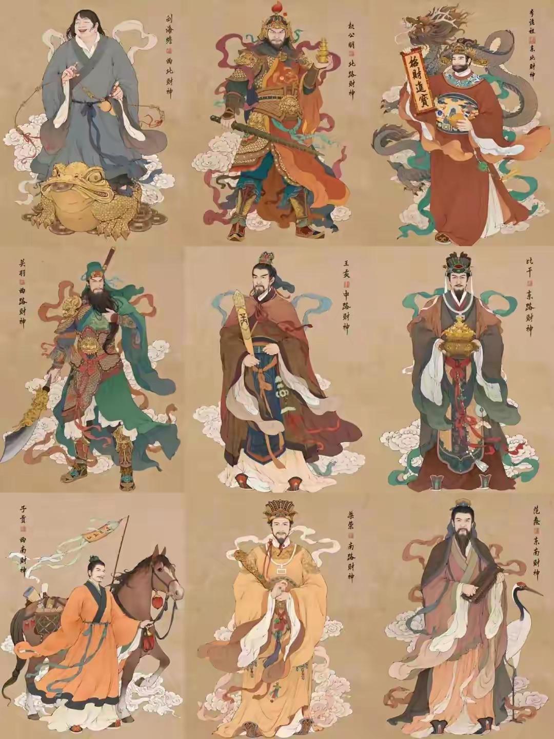 大年初五,财神到,各路财神到你家 九路财神以后天八卦九宫为基底,形成“中路为核心、八方为羽翼”的完整求财体系,兼顾正财与偏财、守成与开拓、公义与智慧,寓意全域通财、德财兼备。以下是各路财神的方位、八卦属性、核心寓意与精准职责,附适合人群与供奉提示。 中路(中宫)· 王亥(华商始祖) - 方位属性:中央,五行属土,主统领与根基。 - 核心寓意:财源总枢纽、商道本源,象征财富的根基与正统,统领八方财神,护佑整体财运稳定。 - 主要职责:总管天下商贸与财源分配;护佑企业根基稳固、产业链完整;倡导“以商兴邦”,主实业兴财、基业长青。 - 适合人群:企业创始人、项目发起人、产业规划者、家族生意掌舵人。 东路(震卦)· 比干(文财神) - 方位属性:东方,五行属木,主生发、公正 。 - 核心寓意:公道正财、光明磊落,因“无心”象征绝对公平,寓意凭本事、守规矩赚“干净钱”。 - 主要职责:掌管东方财源;护佑职场晋升、薪酬稳定;主公平交易、公职俸禄,杜绝商业欺诈与职场不公。 - 适合人群:公职人员、司法审计、教育工作者、文职人员、诚信经营者。 南路(离卦)· 柴荣(君财神) - 方位属性:南方,五行属火,主鼎盛、光明 。 - 核心寓意:惠民兴财、国泰民安,象征“藏富于民”,财富服务于民生与实业发展。 - 主要职责:掌管南方财源;护佑制造业、基建、物流、农耕等实业;主扩大再生产、就业增收,推动产业繁荣。 - 适合人群:工厂主、基建从业者、物流供应链、农业产业化项目方。 西路(兑卦)· 关羽(武财神) - 方位属性:西方,五行属金,主收敛、信誉 。 - 核心寓意:信义立财、义利共生,以“忠义诚信”为核心,寓意“人无信不立,商无信不兴”。 - 主要职责:掌管西方财源;护佑金融信贷、商贸合作、合伙生意;主守财护利、化解契约纠纷,维护商业信誉。 - 适合人群:金融从业者、企业家、销售团队、商业合作伙伴。 北路(坎卦)· 赵公明(正财神) - 方位属性:北方,五行属水,主收藏、险中求胜 。 - 核心寓意:正财总管、镇宅护财,五路之首,威风凛凛,寓意“天道酬勤,财路正统”,兼具镇宅避邪之功。 - 主要职责:掌管北方财源;统管正财与合规偏财;护佑投资安全、生意兴隆;主镇宅化煞、抵御财务风险。 - 适合人群:投资者、个体工商户、创业者、高风险行业从业者。 东南(巽卦)· 范蠡(商圣) - 方位属性:东南,五行属木,主灵动、进退 。 - 核心寓意:智慧生财、善聚善散,象征经商的谋略与格局,寓意“知进知退,财富长久”。 - 主要职责:掌管东南财源;护佑投资决策、资产配置、跨界经营;主低买高卖、规避泡沫,倡导富而好施。 - 适合人群:投资人、理财师、战略规划者、文创与新经济从业者。 西南(坤卦)· 端木赐(子贡) - 方位属性:西南,五行属土,主包容、承载 。 - 核心寓意:儒商财、口才聚财,儒商鼻祖,象征“文质彬彬,然后君子”,以诚信与学识致富。 - 主要职责:掌管西南财源;护佑文化教育、出版传媒、咨询销售;主人脉拓展、口碑传播,推动文化与商业融合。 - 适合人群:教育培训、文创产业、咨询顾问、销售精英、儒商。 东北(艮卦)· 李诡祖(增福财神) - 方位属性:东北,五行属土,主稳定、积累 。 - 核心寓意:增福添禄、细水长流,民间称“增福相公”,寓意福气与财运同步增长,收入稳步提升。 - 主要职责:掌管东北财源;护佑工薪阶层、副业收入、年终奖金;主家庭理财、积少成多,提升整体福运。 - 适合人群:上班族、副业经营者、家庭主妇、退休人员。 西北(乾卦)· 刘海蟾(福运财神) - 方位属性:西北,五行属金,主刚健、福运 。 - 核心寓意:意外之财、福运天成,“刘海戏金蟾,步步吐金钱”,寓意“无心插柳柳成荫”,凭福运得偏财。 - 主要职责:掌管西北财源;护佑彩票、奖金、专利收益、网红经济等意外收入;主散财济贫、福泽众生。 - 适合人群:自由职业者、创意产业从业者、彩票爱好者、期待“锦上添花”的人。 核心逻辑与供奉要点 1. 体系核心:中路定根基,四正(东、南、西、北)主正财与守成,四隅(东南、西南、东北、西北)主智慧与增量,缺一不可。 2. 方位对应:严格遵循后天八卦,可结合家居/办公的九宫方位摆放,如东路比干放左侧青龙位,西路关羽放右侧白虎位。 3. 德财合一:九路财神均强调“德”为财之本,比干的“公”、关羽的“信”、范蠡的“智”,既是求财之道,也是为人处世之则。财神方位 扇形五路财神 五路全通