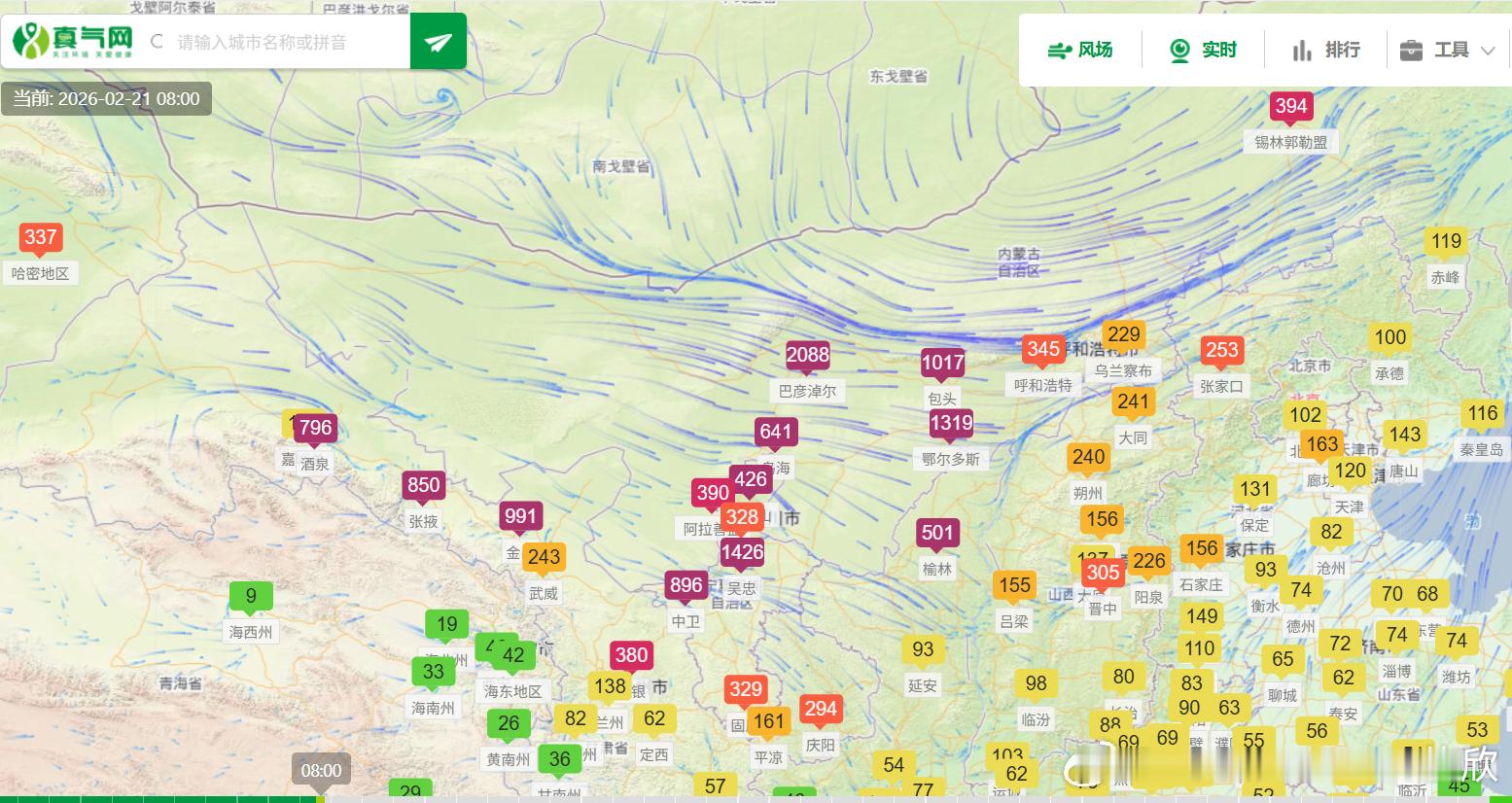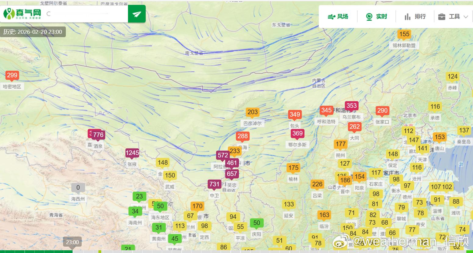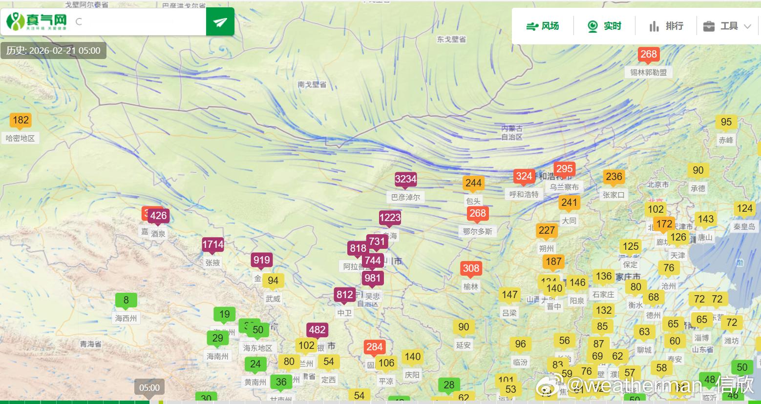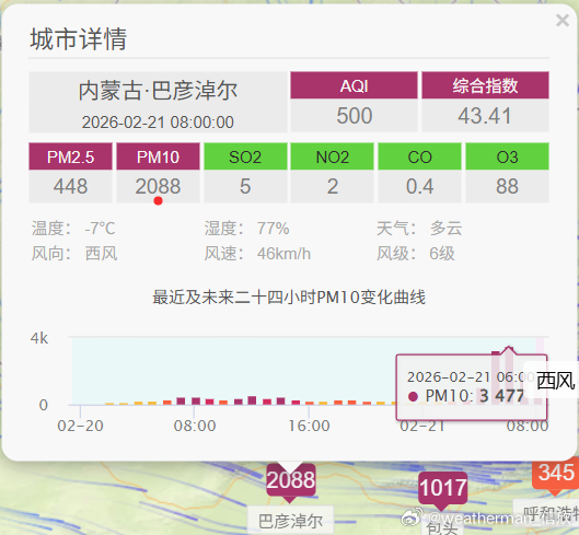【今年以来最强沙尘过程】从昨晚到今晨的PM10浓度监测看,西北上游的沙尘发展增多,新疆哈密、甘肃酒泉、张掖、金昌、宁夏中卫、吴忠、银川、石嘴山、内蒙古阿拉善盟、乌海、巴彦淖尔、鄂尔多斯,均出现爆表。其中巴彦淖尔,今晨6时PM10峰值浓度有3477微克/立方米,5倍多的爆表。