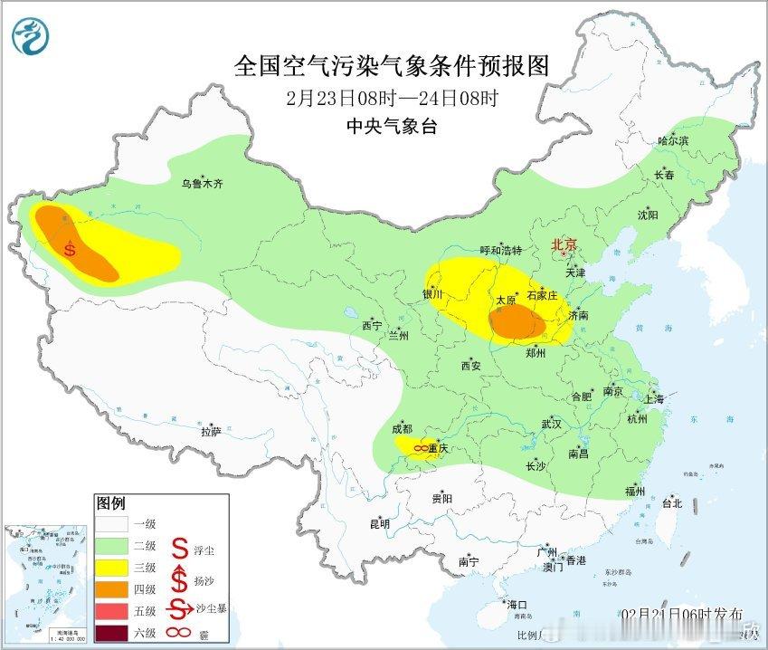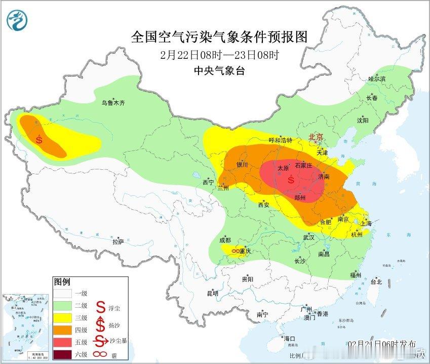 今天沙尘会随着西北风东移南下。今天白天到明晨,新疆东部和南部、内蒙古中西部、青海东北部、甘肃中西部、宁夏、陕西大部、山西、北京、天津、河北、河南、山东、湖北北部、安徽中北部、江苏中北部等地有扬沙或浮尘天气,其中,内蒙古西部、甘肃西部、宁夏中北部、陕西北部等地的部分地区有沙尘暴,局部有强沙尘暴。