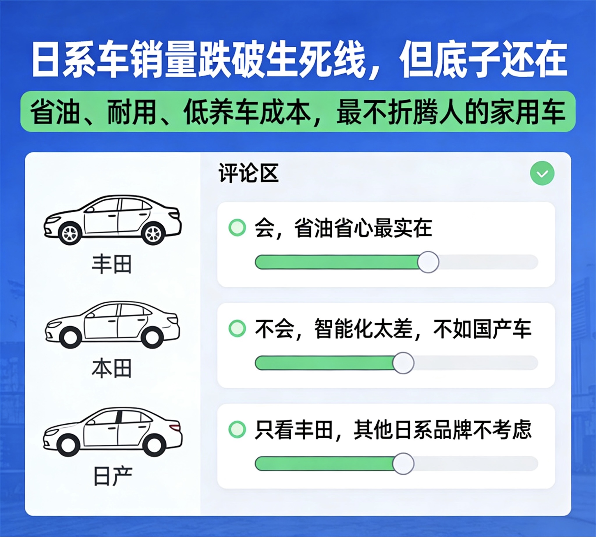 本次实地调研102位日系真实车主(丰田42位/本田31位/日产29位),用车时长1-8年,行驶里程2万-26万公里,覆盖城市通勤、高速长途、家用代步、网约车全场景,结合J.D.Power、中国汽车流通协会官方数据,用实打实的数字说透:日系车现在到底值不值得买?