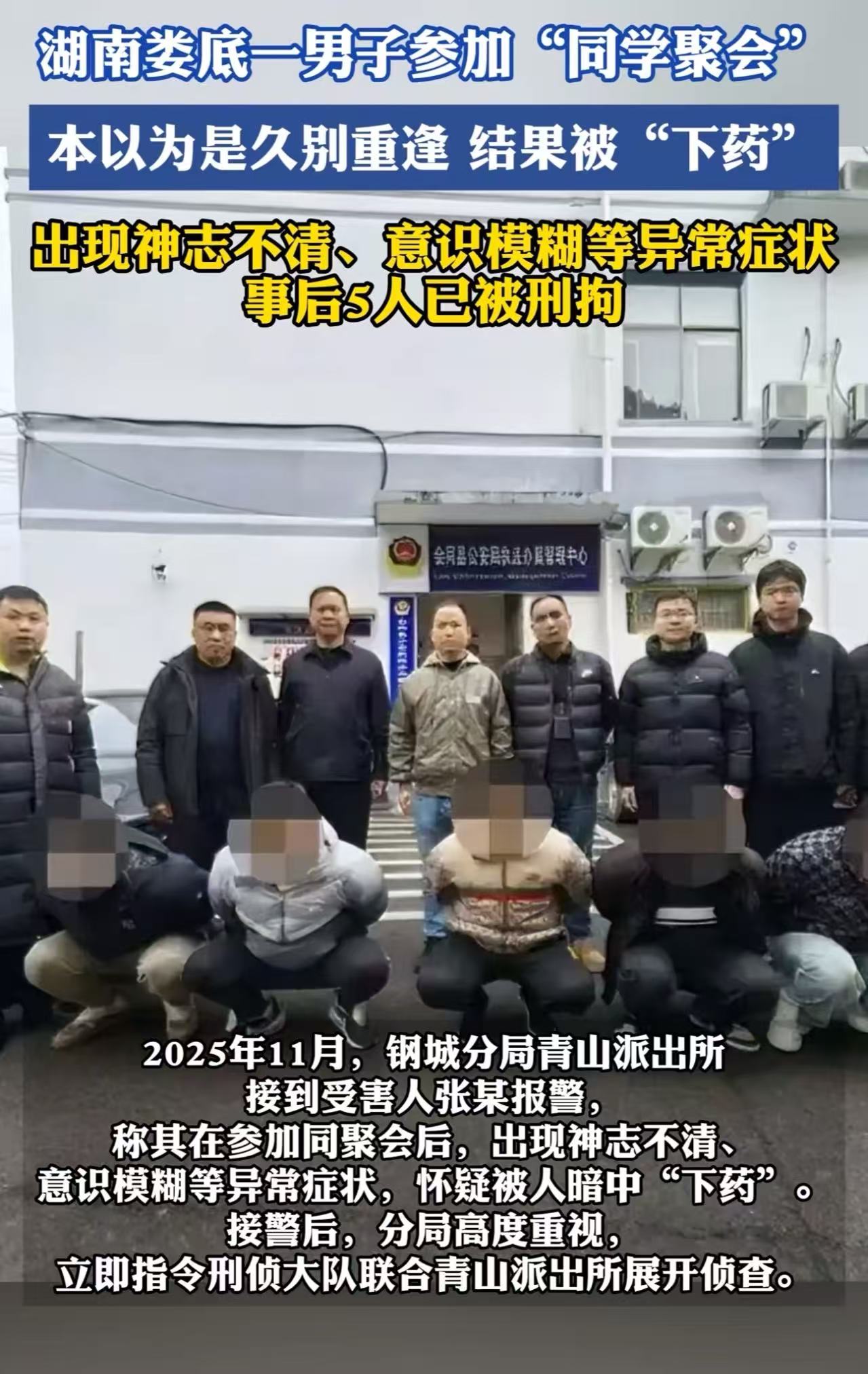 同学聚会变‘杀猪局’!湖南一男子参加“同学聚会”被“下药”设局,幸亏药效发作前提前离场躲过一劫!警方:5人被刑拘!”网友:熟人下手最狠!