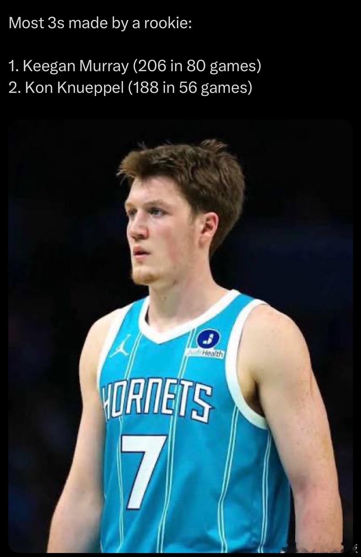 榜单第一名为基根-穆雷(80场命中206记三分),而克努佩尔56场比赛已命中188记三分骑士vs黄蜂