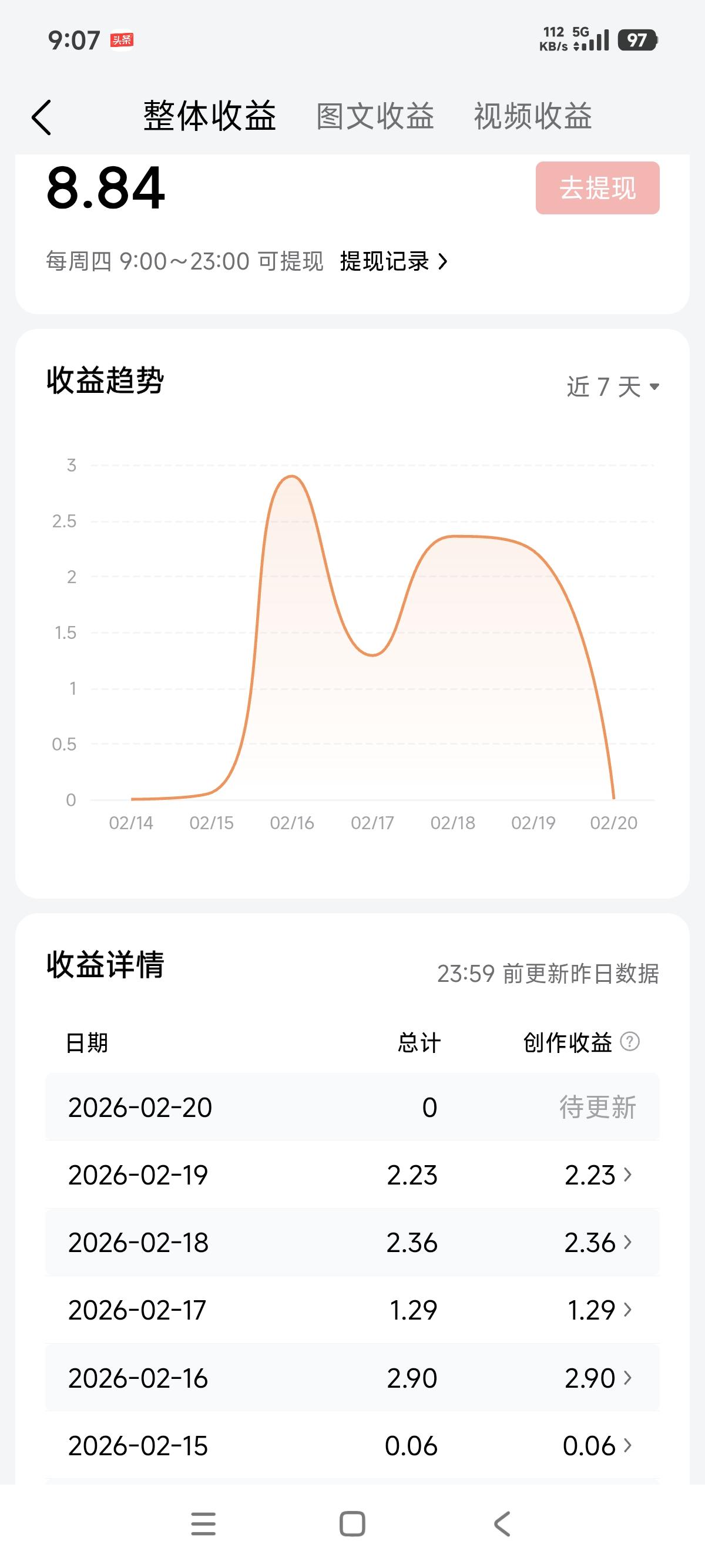 这是我做的第二个账号,最近几天收益虽然不高,但是很满足,收益不高的原因有两个,第一就是过年没有太多时间更新内容,所以这都是以前内容的浏览量带来的收益,过完年努力更新相信收益会增加!第二就是我这是一个新账号,粉丝量比较少,所以浏览量少也是必然的!如果日积月累坚持创作,相信收益会进一步增加!