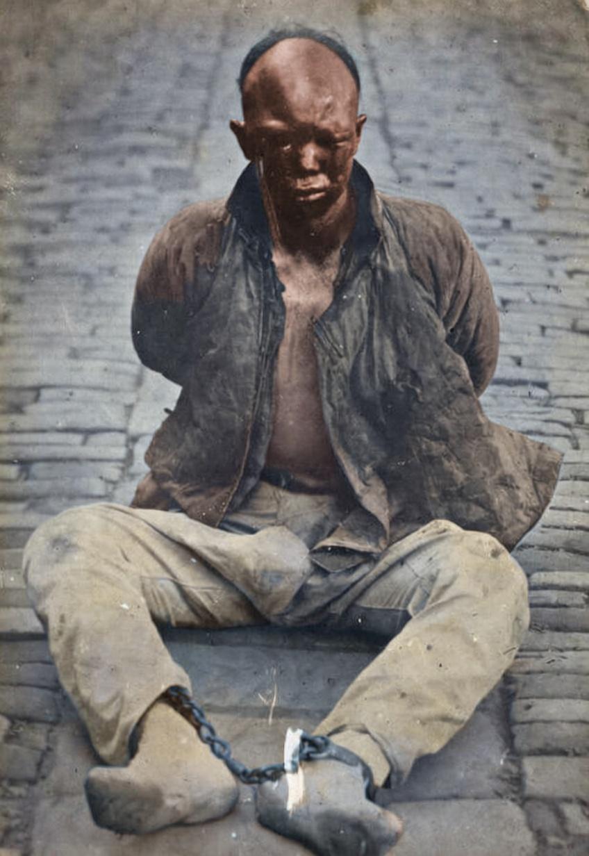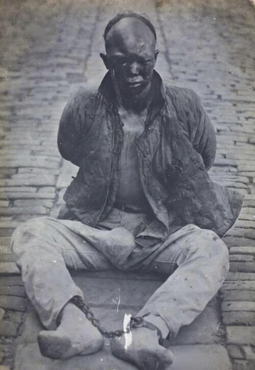 这张照片定格的,是武昌起义前夜,革命党人杨洪胜被捕后受尽酷刑的瞬间。他双眼被打肿,脸上凝着血痕,双手反绑、脚戴镣铐,颓然坐在汉口租界的青石板路上,却始终未发一声求饶之语。 1911年10月9日,宝善里炸弹案爆发,起义计划暴露。杨洪胜作为革命党人的“弹药使者”,在向工程营运送军火时被清军尾随捕获。面对严刑拷打,他始终未供出任何一位同志,反而怒骂清吏无耻。10月10日凌晨,他与彭楚藩、刘复基一同被斩首于湖广总督署东辕门外,三人也因此被誉为“武昌首义三烈士”。 这张照片本是清军为了震慑革命党人而拍摄,却意外成为了杨洪胜烈士傲骨铮铮的永恒见证。他的鲜血没有白流,就在他牺牲的当天傍晚,武昌起义的枪声划破夜空,清王朝的统治也随之土崩瓦解。