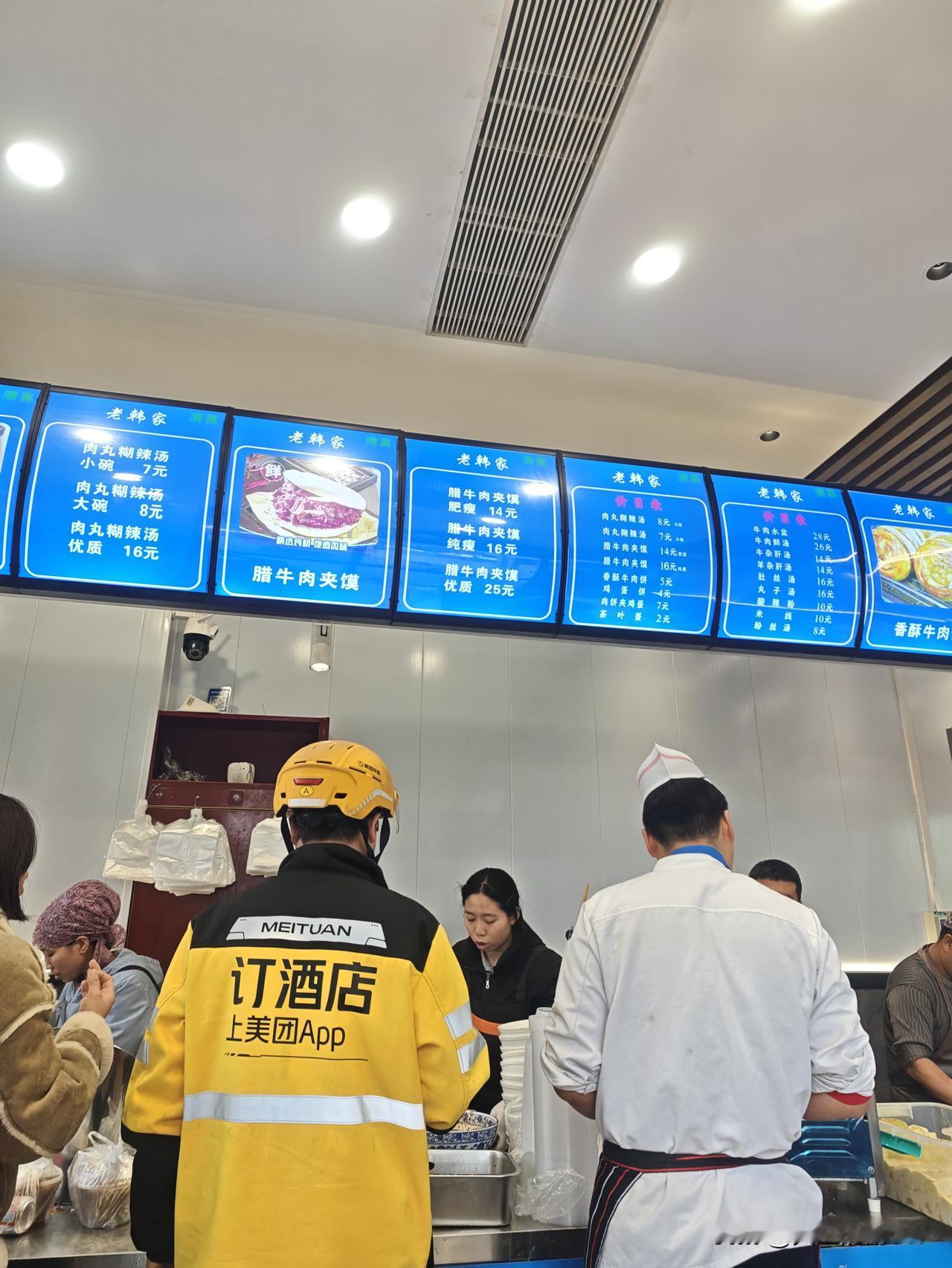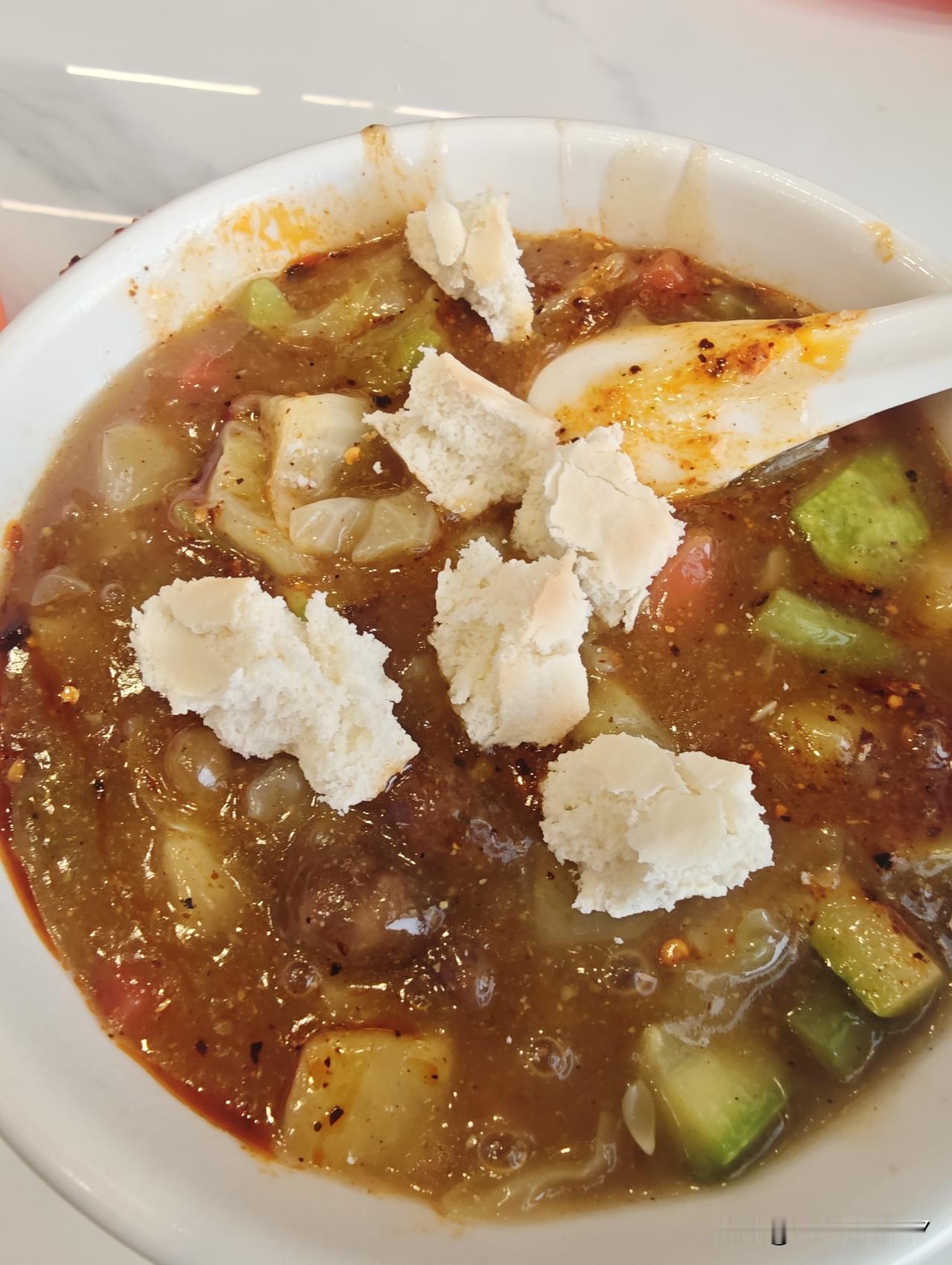 今日正值大年初五,也是财神归位之时。清晨,我瞧见一家店铺仍在营业,便进去要了一碗颇具陕西特色的肉丸胡辣汤。未曾想,店内顾客众多,需排队等候。我点了一个白饼和一碗胡辣汤。回民似乎不过春节吧!