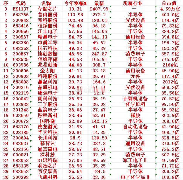 普冉股份:今年涨幅 +113.98%,最新价 272.20元,总市值 403.0亿元帝科股份:今年涨幅 +102.48%,最新价 120.01元,总市值 174.4亿元恒烁股份:今年涨幅 +74.46%,最新价 96.18元,总市值 79.83亿元江丰电子:今年涨幅 +57.66%,最新价 145.05元,总市值 384.8亿元精测电子:今年涨幅 +54.75%,最新价 141.13元,总市值 394.8亿元中微半导:今年涨幅 +54.34%,最新价 49.62元,总市值 198.7亿元国芯科技:今年涨幅 +49.23%,最新价 45.29元,总市值 152.2亿元协创数据:今年涨幅 +46.95%,最新价 247.87元,总市值 857.9亿元佰维存储:今年涨幅 +44.53%,最新价 165.91元,总市值 775.0亿元兆易创新:今年涨幅 +44.08%,最新价 308.70元,总市值 2164亿元