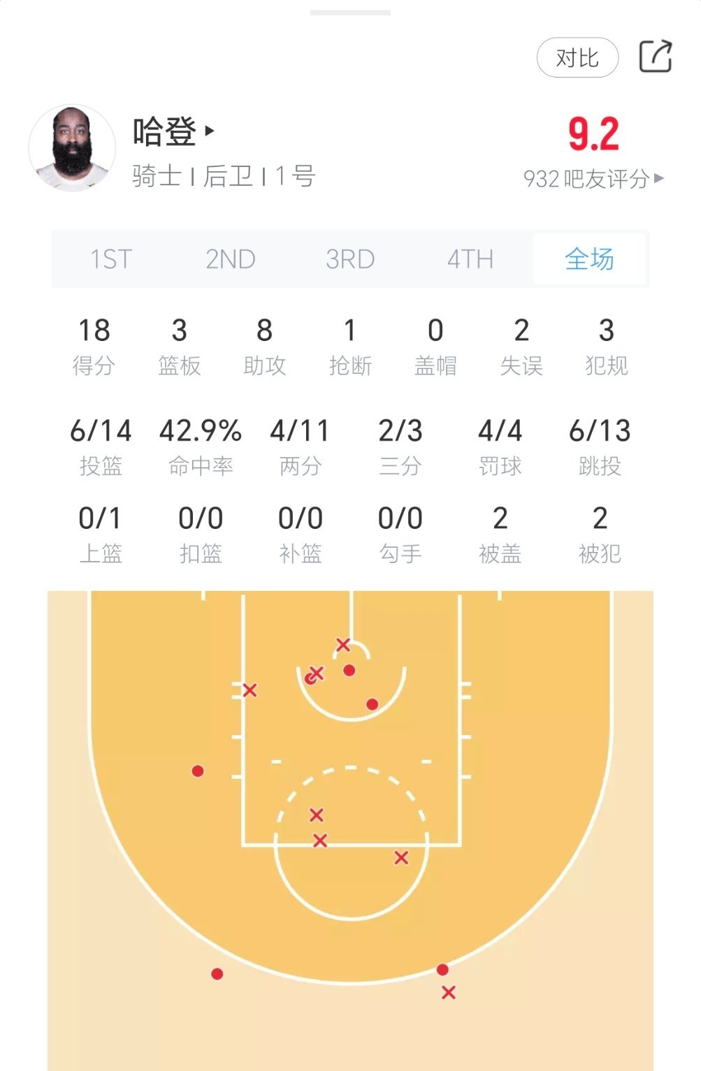 高级指挥官!哈登今日表现:骑士vs黄蜂