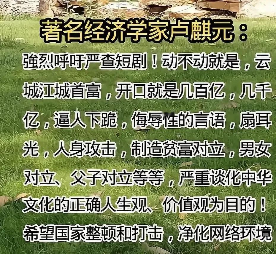大年初三,著名经济学家卢麒元强烈呼吁: 严查网上短剧!动不动就是云城江城首富,开口就是几百亿、几千亿! 春节闲暇刷手机,这类短剧总能霸满推荐页面,千篇一律的豪门设定、脱离现实的财富神话,看似解压爽感,实则悄悄扭曲着大众的价值认知。 卢麒元选在大年初三发声,根本不是挑节日的毛病,是他亲眼看见乱象藏不住了。 他不光盯着虚假的千亿财富,更揪着剧情里嫌贫爱富、制造对立的烂桥段。 这种内容天天刷屏,普通人的尊严都被踩在金钱脚下,谁看了不揪心。 咱随手点开一部短剧,主角不是隐世大佬就是天降首富,谈生意张口就是千亿。 现实里多少人打拼一辈子,都攒不下一套刚需房的首付,剧里钱跟大风刮来的一样。 这种极端反差看着爽,实则一点点磨掉大家对劳动致富的敬畏心。 平台算法还专门盯着年轻人猛推,十几岁的孩子最容易被这种剧情带偏。 有调查数据摆着,常看炫富短剧的青少年,更把金钱当成成功的唯一标尺。 他们嫌弃上学苦、打工累,天天幻想继承百亿家产,连人生方向都摸不清了。 这些短剧全是流水线生产,换个剧名、换张演员脸,内核套路一模一样。 没有现实根基,没有正向引导,唯一目的就是靠爽感留住用户赚流量。 流量赚到手了,却把大众的价值观带歪,这笔账根本算不清也赔不起。 卢麒元的呼吁,戳中了网络内容最该管的一个大痛点。 娱乐可以轻松接地气,但不能用虚假财富叙事撕裂社会、误导孩子。 踏踏实实靠双手过日子的人,永远不该被这些无脑爽剧看不起。 咱们刷剧的时候真得留个心眼,图一乐就行,千万别把虚拟剧情当现实。 别让满屏的千亿噱头,迷了心智、丢了对生活的清醒认知。 守住劳动的价值、守住平凡的底气,才是最靠谱的活法。 各位读者你们怎么看?欢迎在评论区讨论。