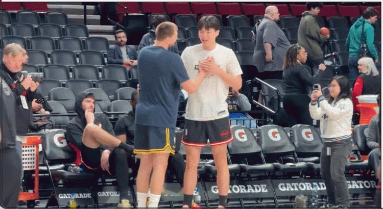 NBA场下花絮:瀚森心心念念的事梦想成真! 全明星后开拓者主场迎战掘金!赛前杨瀚森和自己的偶像约基奇开心聊天!值得期待的是正赛杨瀚森能上场同自己的偶像巅峰对决吗?打铁还需自身硬,无须扬鞭自奋蹄。加油吧杨瀚森。杨瀚森 杨瀚森打球 姚明寄语杨瀚森 开拓者球星