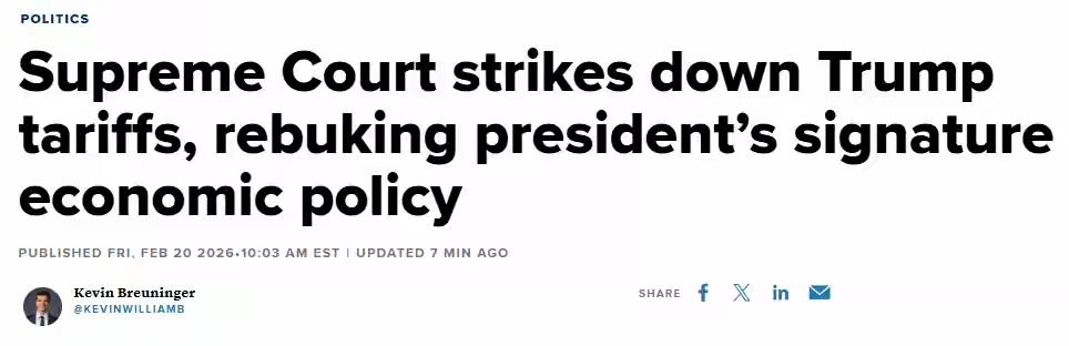 6:3!最高法院推翻特朗普全球关税,退款来袭,白宫紧急启动B计划 2026年2月20日,美国最高法院以6:3的关键投票,裁定特朗普政府依据《国际紧急经济权力法》(IEEPA)征收的全球关税无法律授权、自始无效 。这颗“司法核弹”不仅推翻了特朗普第二任期最核心的经济武器,更让白宫面临1750亿美元的巨额退款压力,一场围绕关税与权力的博弈瞬间白热化 。 一、裁决落地:保守派“倒戈”,总统越权被钉死 特朗普2025年初重返白宫后,绕开国会、直接援引1977年的IEEPA,以“贸易逆差威胁国家安全”“打击芬太尼走私”为名,对全球主要贸易伙伴加征**10%-50%**的“对等关税”,对加墨等国另征25%“贩运关税”,覆盖之广、力度之大史无前例 。 此举迅速引发诉讼:美国小企业与12个州联合起诉,直指关税权归国会、总统无权以“紧急状态”越权征税 。2025年5月国际贸易法院、8月联邦巡回法院均裁定违法,直至最高法院终审 。 最具戏剧性的是,9位大法官中6位保守派、3位由特朗普亲自任命,最终却有两位特朗普任命的大法官(戈萨奇、巴雷特)与自由派联手,以6:3投下反对票 。首席大法官罗伯茨执笔多数意见,明确IEEPA仅用于制裁与资产管控,从未授权总统征收全球性关税。 特朗普当天脸色铁青,怒斥裁决“可耻”,暗示法官受外国影响,但司法独立的底线已被牢牢守住。 二、巨额退款:1750亿美元悬顶,企业磨刀霍霍 裁决明确:基于IEEPA的关税自始无效,已征收的税款需退还 。沃顿模型测算,总额高达1750亿美元,相当于美国年度财政收入的近十分之一 。 美国财政部与海关瞬间陷入困境:退款流程、资格认定、资金来源均无先例,企业已组建联盟发起集体索赔,这场“退税大战”大概率要在法庭缠斗5年以上 。对美国企业而言,这是迟来的“减负”;对白宫而言,则是财政与政治的双重暴击。 三、白宫B计划:临时关税+多线调查,困局难破 裁决出炉仅数小时,特朗普便签署新行政令,紧急启动B计划: - 第122条临时关税:对全球加征10%关税,2月24日生效,但最高税率15%、有效期仅150天,国会不批准则自动失效,本质是“临时工方案”。 - 第301条+第232条调查:启动“不公平贸易”与“国家安全”调查,试图为针对性关税找法律依据,但程序繁琐、范围受限,远不如IEEPA“想征就征”高效 。 共和党在国会仅微弱多数,且不少议员早已反对单边关税,特朗普“不需要国会授权”的强硬表态,在现实中寸步难行 。 四、全球影响:红线已画,博弈未止 此次裁决为总统关税权划下明确法律红线:不能再以“紧急状态”绕开国会、全球征税 。但基于国家安全的钢铝、汽车等关税依然有效,白宫的替代方案也在推进,全球贸易的不确定性并未消除 。 对各国企业与美国消费者而言,这是短期喘息窗口:进口成本下降、物价压力缓解;但长期看,美国内部“行政权vs立法权vs司法权”的拉锯,仍将持续扰动全球供应链 。 从一家教育玩具公司、一家葡萄酒进口商牵头,到12个州联手,再到最高法院终审,这场“以小搏大”的法治博弈,最终证明:权力再大,也不能凌驾于法律之上 。 1750亿退款待付,150天临时关税倒计时,特朗普的关税执念与最高法院的法律红线,将继续拉扯2026年的全球贸易格局。上联:月落西山大地暗;请接下联 美伊核谈判是否能带来和平