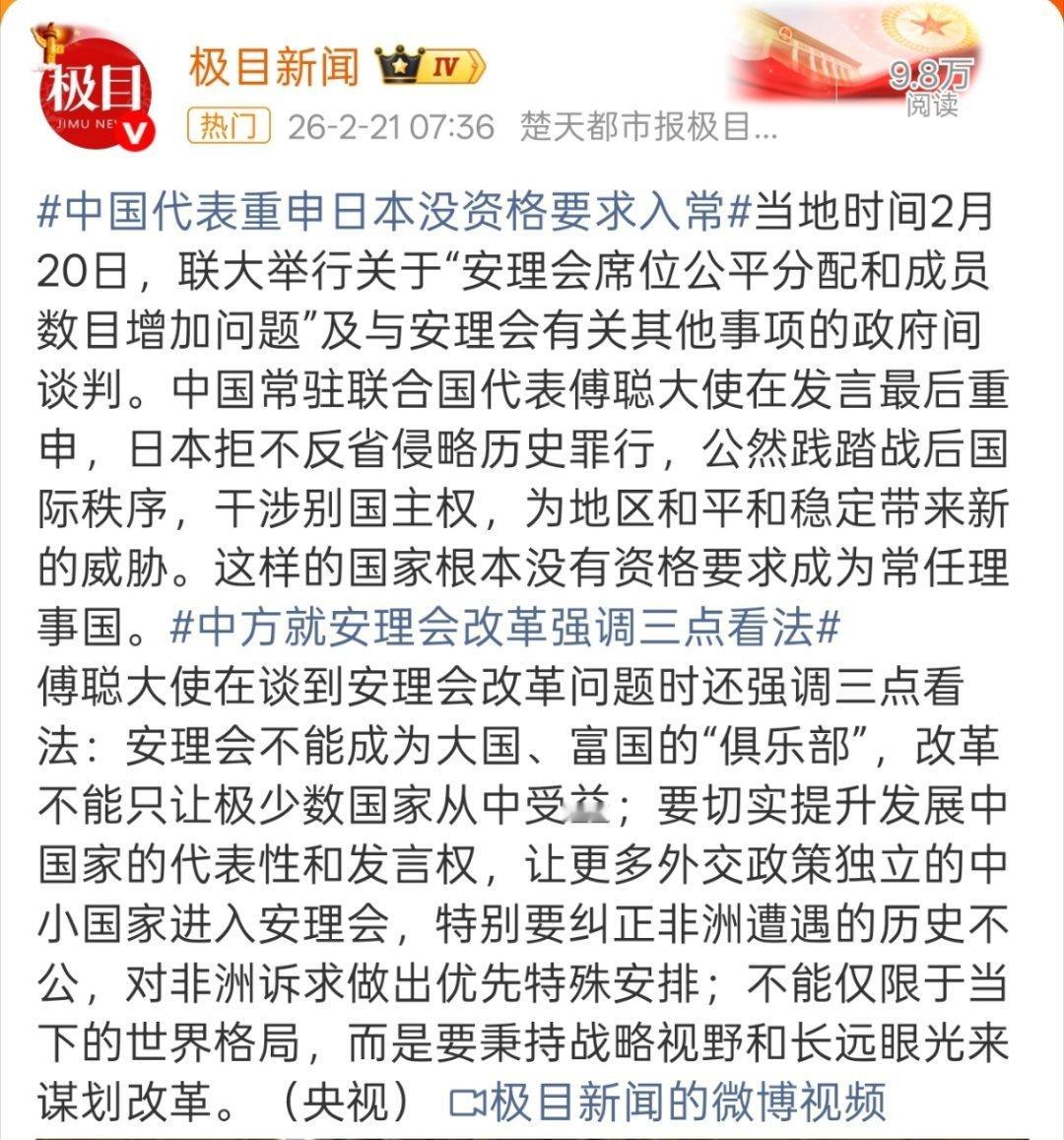 中国代表重申日本没资格要求入常就是没资格,要是主动挑起二战且罪行累累的国家都能入常,就是对五常的集体羞辱,这些可都是二战战胜国。