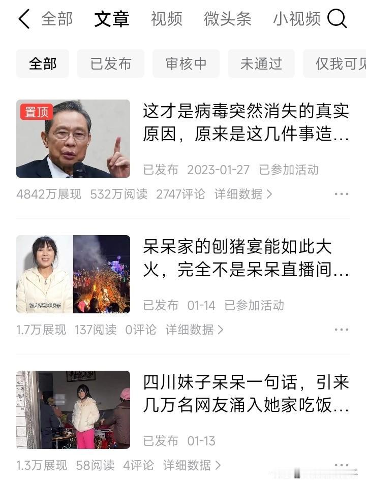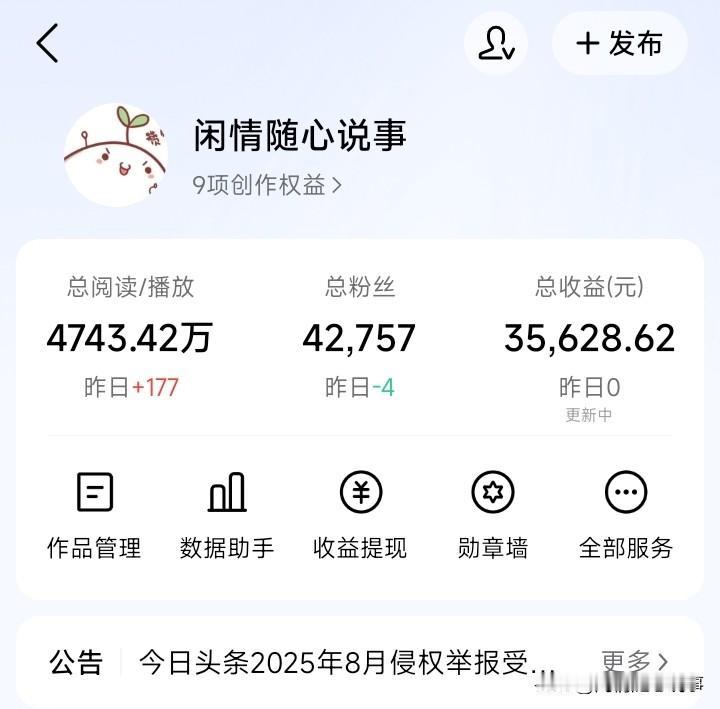 在头条写作也有1500多天了,也曾写出过阅读量过500W的文章,单篇收益过3000的文章也有好多篇,但现在我每天收益却只有几分钱… 我的惨痛经历只想告诉各位,一定不要断更!一定不要断更!一定不要断更! 以前不晓得断更有这么大的后续影响,早知道的话,哪怕每天只写一个微头条,那我也会打开头条写上一篇。 可惜没有后悔药啊,哪怕我曾努力回来写,但直到现在还没把号给养回来,看着苗京京她们每天收益都好几百,说不眼红那是假的。 我断更了好几次,最长断更了差不多半年之久,根据我的观察来看,你要是断更一两个月的话,还是对自己账号影响不太大。 主要我断更次数比较多,再加上断更半年时间太久了,就跟上班一样,你要是经常迟到早退的话,也会被判定成做事不认真的懒散员工。 同样的,来头条写作的人那么多,你要是经常有事没事就断更,自然而然也不会愿意推荐你的作品,久而久之你就成了透明一样,发什么也不会被看到了。 再次奉劝大家一句,千万千万不要随便断更啊…