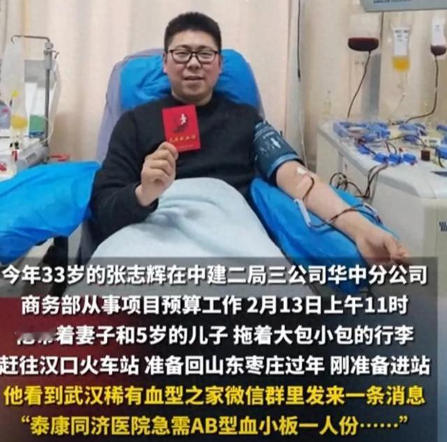 春运期间,汉口火车站里,33岁的张志辉带着妻儿准备回山东老家过年。就在即将进站的时候,他看到微信群里的紧急求助,医院急需AB型Rh阴性血小板,符合条件的人只有他一个。他没有丝毫犹豫,当场决定退票,让妻子和孩子先回家,自己立刻赶往医院献血。 当时孩子还小,不明白爸爸为什么不跟着一起走,哭着喊着不让他离开。张志辉心里也不好受,他蹲下来抱了抱孩子,简单交代几句之后,转身就往火车站外面跑。他知道,多耽误一分钟,等待救治的病人就多一分危险。 赶到血液中心之后,张志辉顺利捐献了一个治疗量的血小板。这已经不是他第一次伸出援手,算上这次,他已经累计献血十五次,捐献的全血和血小板总量,已经超过一个成年人全身的血液量。从得知自己是稀有血型开始,只要有紧急招募,他只要符合条件就一定会参加。 他心里很清楚,自己晚回家几天只是小事,最多就是多等几趟车。可对于躺在病床上的患者来说,这一份血小板可能就是活下去的希望,是能不能和家人团圆的关键。他没有想过要被人称赞,也没有觉得自己做了多么了不起的事情,只是在别人需要的时候,做出了最本能的选择。 很多人都在赶回家团圆,张志辉却为了让另一个陌生人能顺利回家,主动停下了回家的脚步。他用最普通的行动,诠释了最实在的善良。这样的普通人,才是春运路上最温暖的风景,也让这个年变得更有温度。