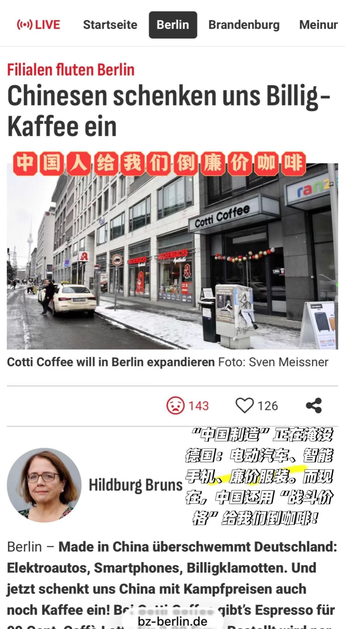 库迪在德国开咖啡店,德国媒体:中国给我们倒廉价咖啡,中国制造正在淹没德国,从手机,电动汽车,廉价衣服到廉价咖啡 德国应该反思自己,为什么能让这些品牌入驻德国,怎么不去批评那些购买的人,倒反过来指责制造商,有需求就有市场,有本事你们自己生产