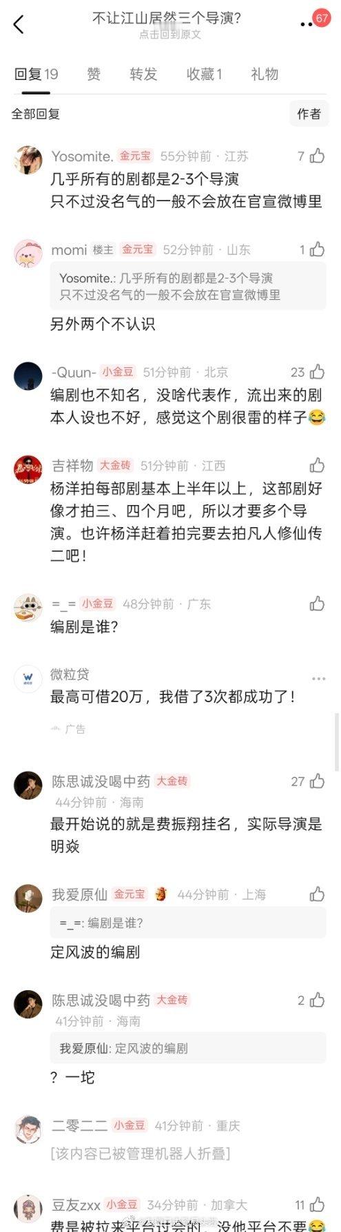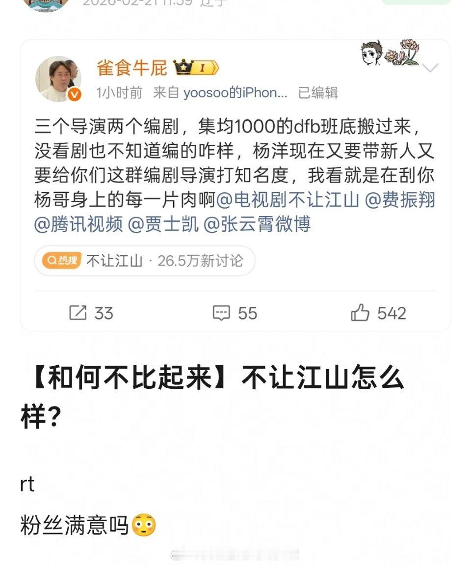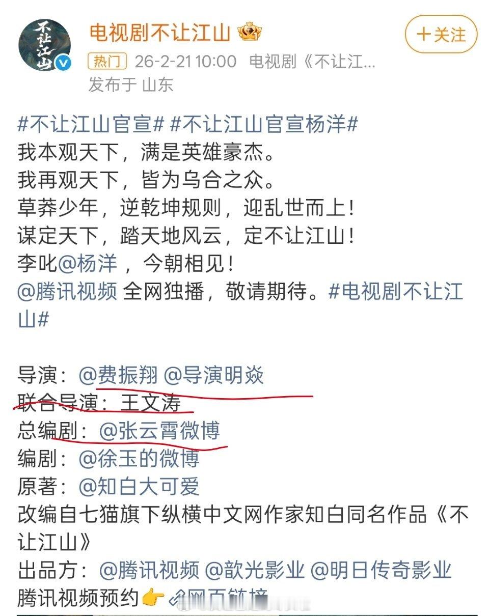 杨洋《不让江山》官宣有三个导演,除了名导费振翔,其他两个导演,一个作品都是非知名作品,一个只做过《东极岛》副导演,加上总编剧李云霄也没有什么成功代表作,被质疑这剧班底不行,费振翔只是挂名过会用的 不让江山官宣杨洋不让江山