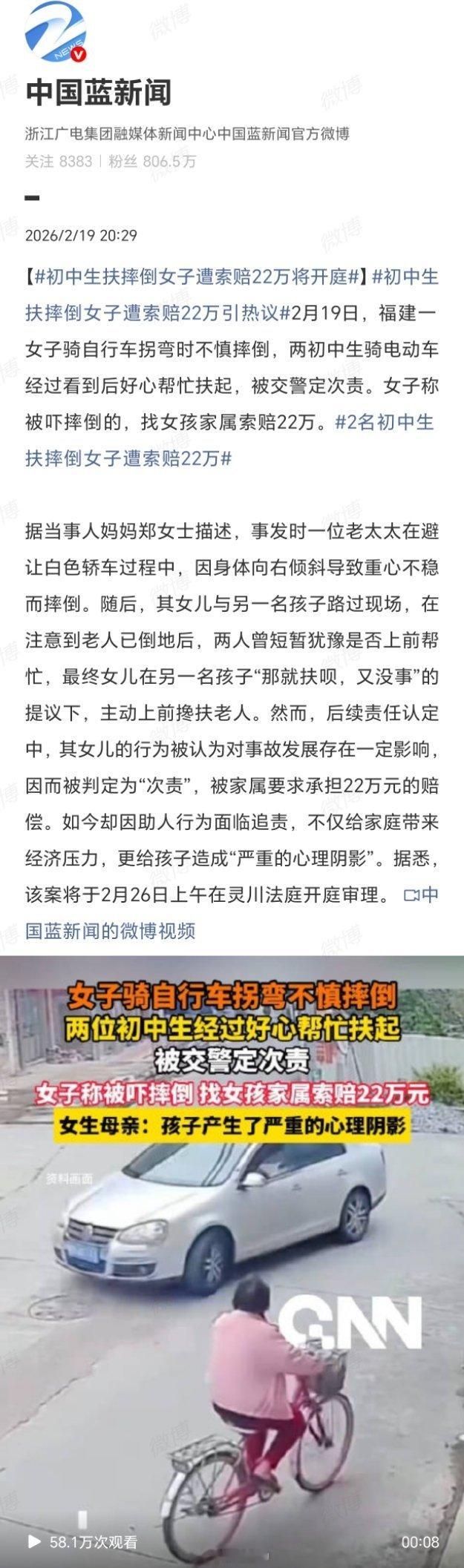 初中生扶摔倒女子遭索赔22万将开庭女儿扶人反被索赔22万母亲发声这起“初中生扶人反遭索赔22万”事件,堪称现代版“农夫与蛇”,其荒谬之处不仅在于对善行的践踏,更在于法律认定上的匪夷所思。